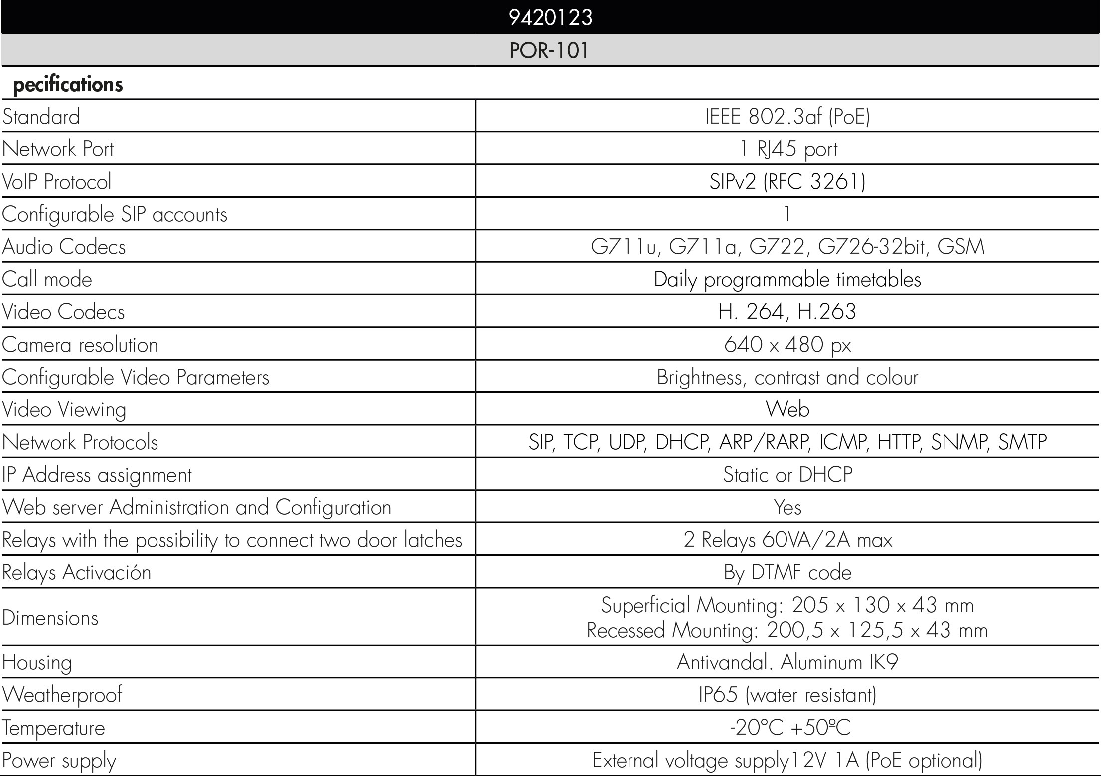 The POR-101 is an IP video door phone with night vision color camera and a call button compatible with IP PBXs based on the SIP protocol. The door phone can be used in any type of environment being water resistant (IP65) as well as having an aluminum housing that makes the device vandal proof. Permits surface mounting or recessed installation in the wall.