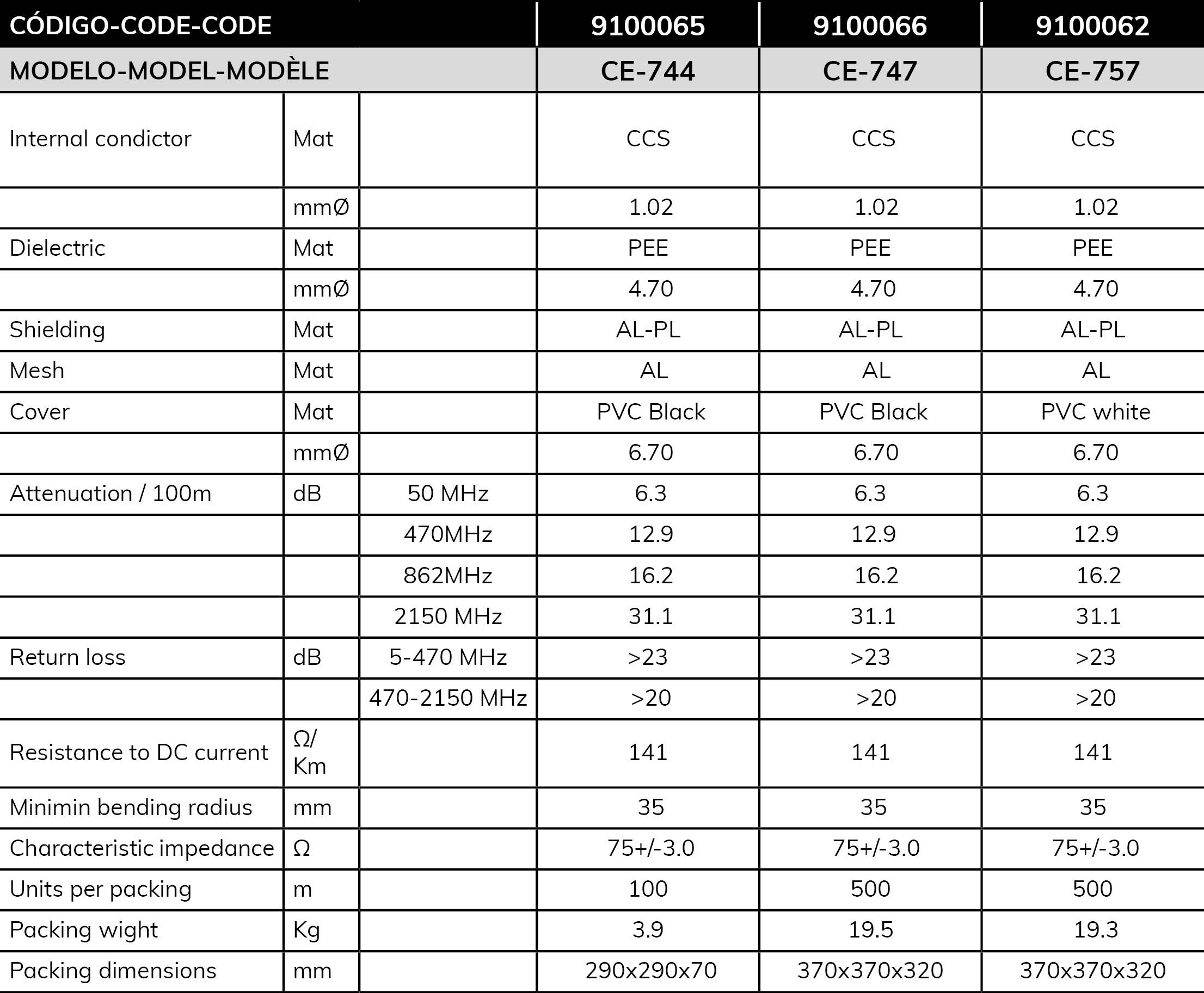 Cable coaxial con dieléctrico expandido físicamente. Retardante de llama. Cumple con la norma EN 50117.