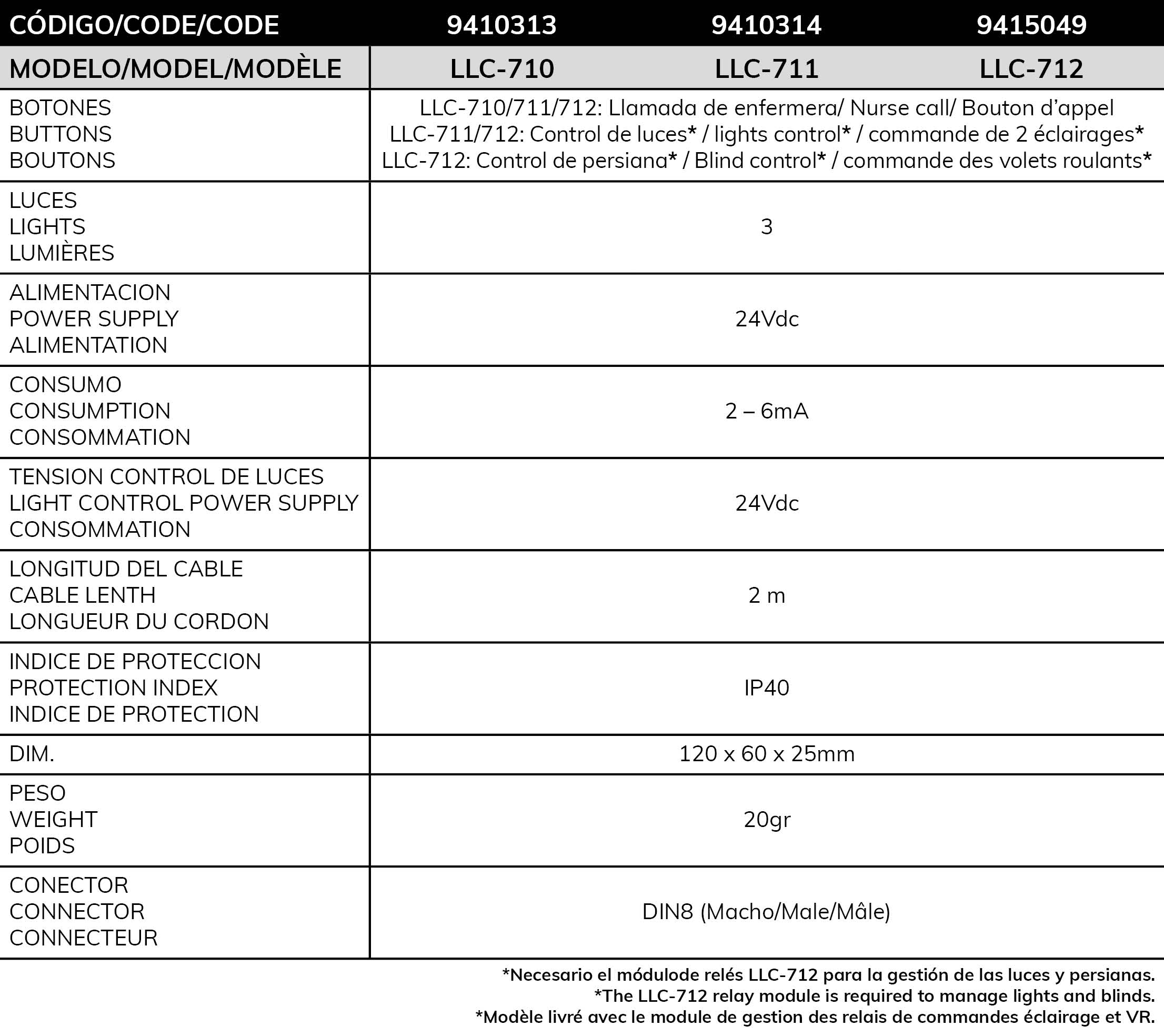 Source d'alimentation, contrôle de la lumière et contrôle de l'obturateur avec un connecteur mâle DIN-8 pour connexion murale LLC-8xx et LLC-9xx. Voici un bouton d'information rouge avec un indicateur LED rouge et un indicateur LED blanc pour l'indicateur d'état de la connexion. Il dispose de 2 boutons pour contrôler seulement 2 lumières dans une pièce. Il vous permet, en tant que patient, de lancer un appel en activant le bouton de l'appel et d'indiquer l'état de l'appel pour la LED de réassurance rouge. Bus périphérique avec un connecteur DIN8. Facile à nettoyer et à connecter.
