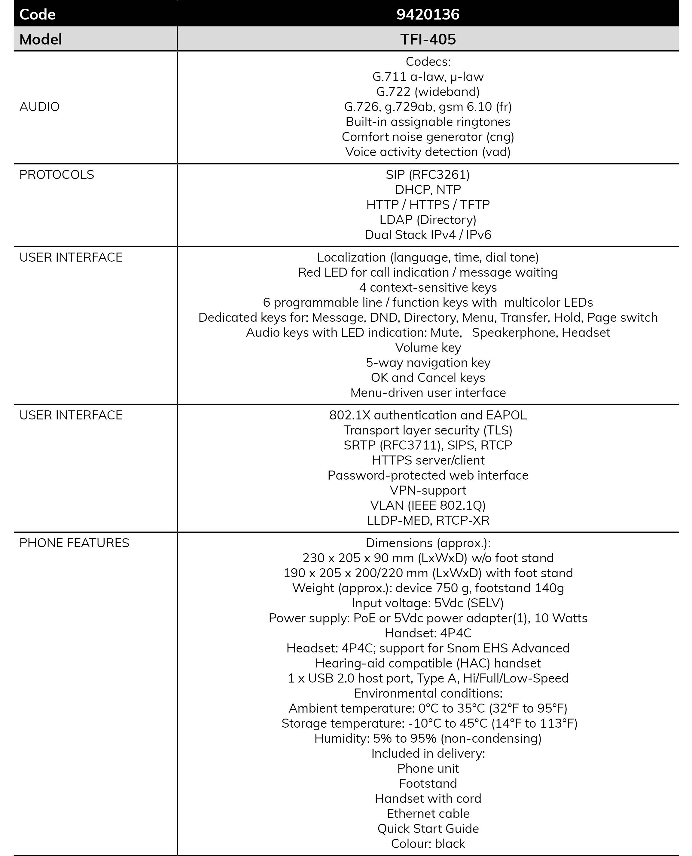 El nuevo modelo TFI-405 transmite una gran versatilidad al usuario. Su gran pantalla a color TFT de alta resolución y las teclas de función programables para una variedad de funciones de telefonía, cuentos como la marcación rápida, usuario ocupado o indicación de presencia, ofrecer al usuario facilidad de navegación y uso. Además cuenta con una segunda pantalla para la gestión de contactos dinámicos que permite aplicaciones de forma rápida y sencilla. Además, el sistema de altavoces y el micrófono y el procesador de señal digital (DSP) aseguran que el modelo ofrece el mejor rendimiento de audio. Si utiliza el altavoz manos libres o el auricular, siempre experimentará con los dos métodos, una calidad de llamada superior. Este modelo cuenta con dos puertos Gigabit Ethernet para cumplir con todos los requisitos exigentes. Con su compatibilidad Bluetooth y un puerto USB de alta velocidad, permite una conexión fácil de varios accesorios como un USB o auriculares Bluetooth, Wi-Fi o un módulo de expansión D7. El TFI-405 es la combinación perfecta de tecnología avanzada y diseño elegante, y establece nuevos accesorios con su interfaz de usuario intuitiva.