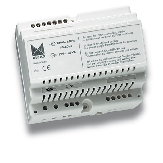 The power supply converts the mains voltage to the voltage required for the video door entry system. 6 element DIN rail format, for mounting on walls or rails. This power supply is protected against short circuits. To be used in 2-Wire installations.