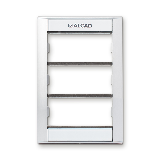 USOA is the Alcad entrance panel with a continuous profile and modular composition. It consists of frames of different sizes and with different numbers of windows where the different modules are fitted: as main audio or video module, push-button modules, iaccess module, card holders ... etc. There are two module sizes: P and G. The G modules occupy 2 frame windows, and the P modules occupy a single window.