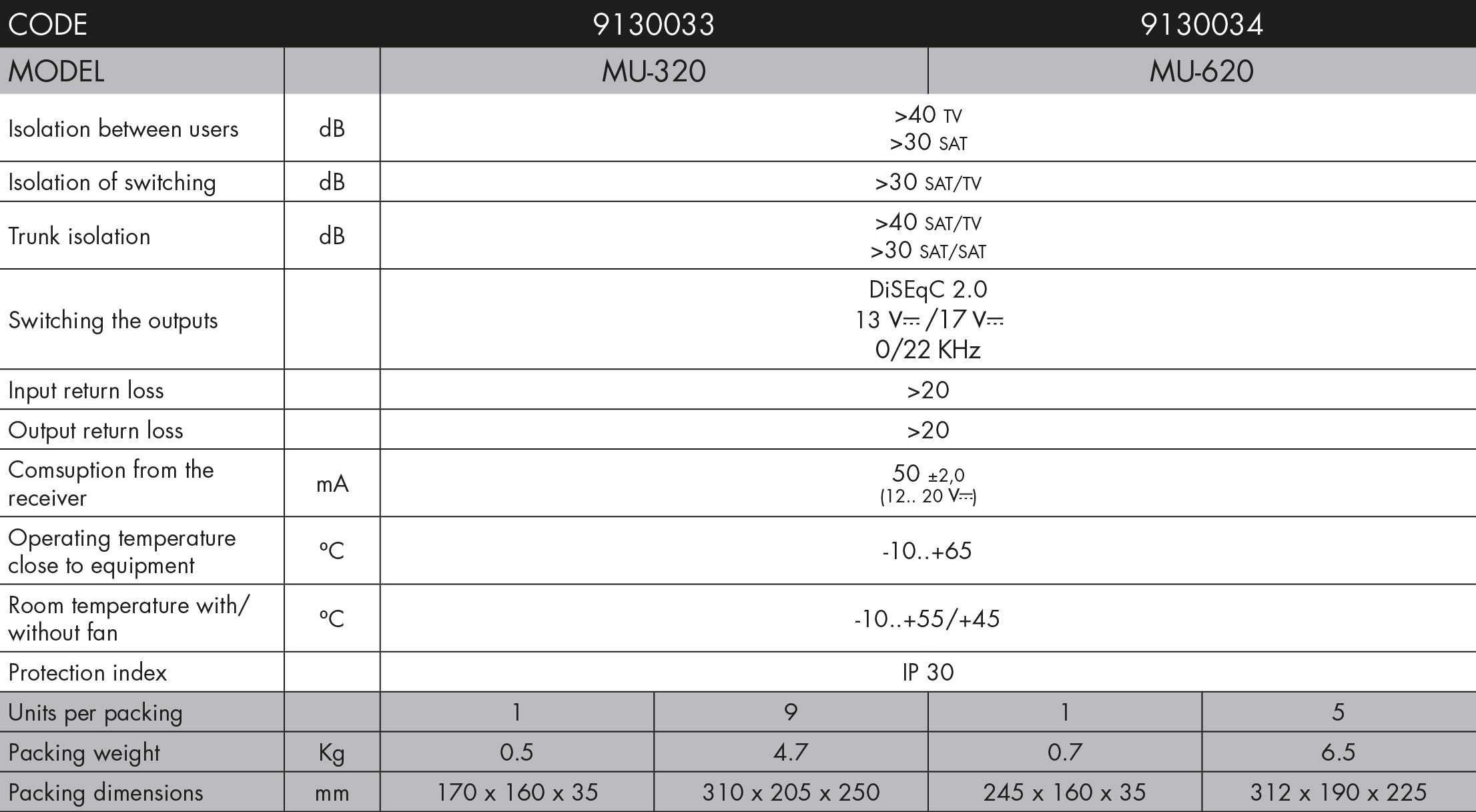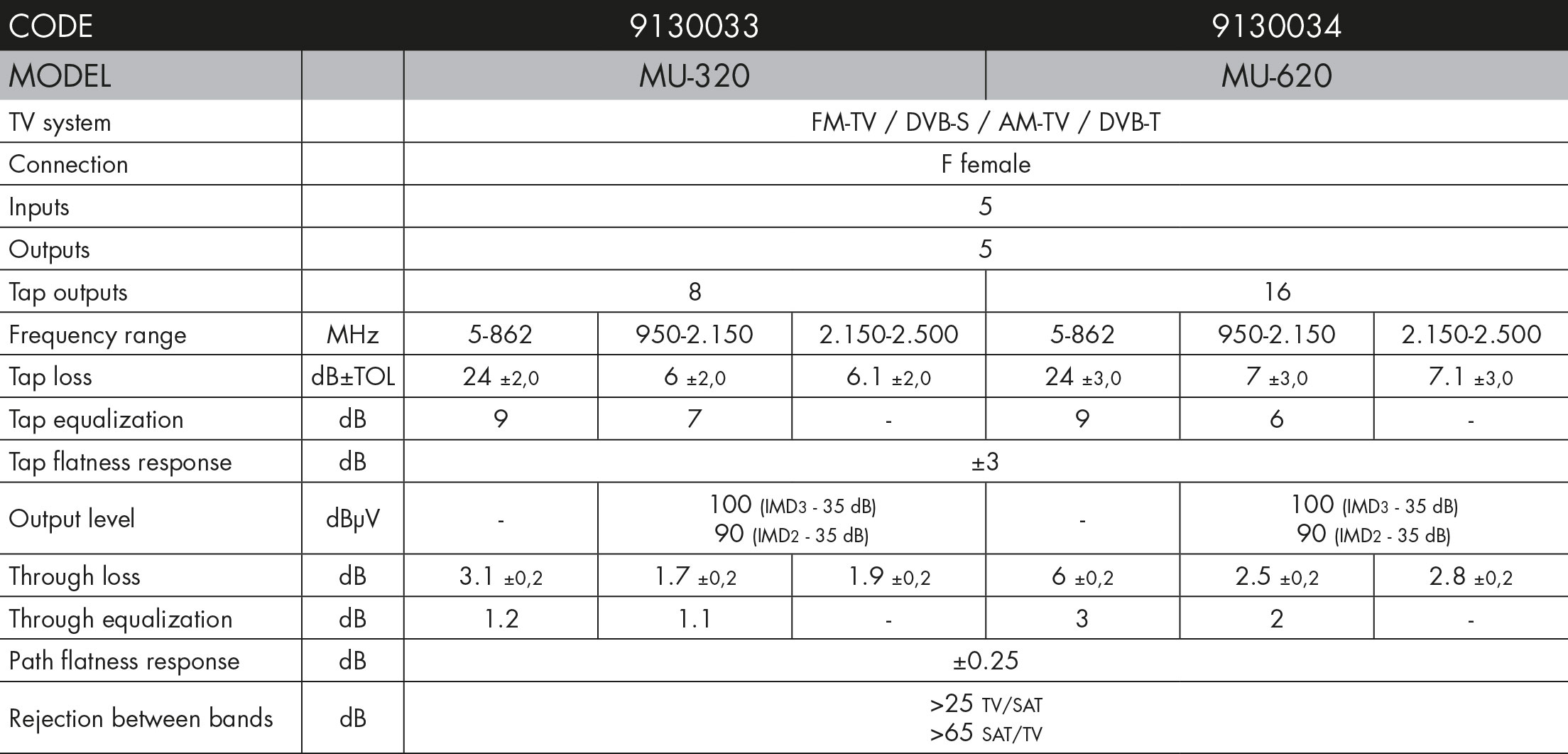 Return path included from 5 to 65MHz. Shielded zamak chassis with plastic supports. F type connectors. Distances of more than 75m between multiswitch and outlet. Up to 100 terrestrial TV channels.