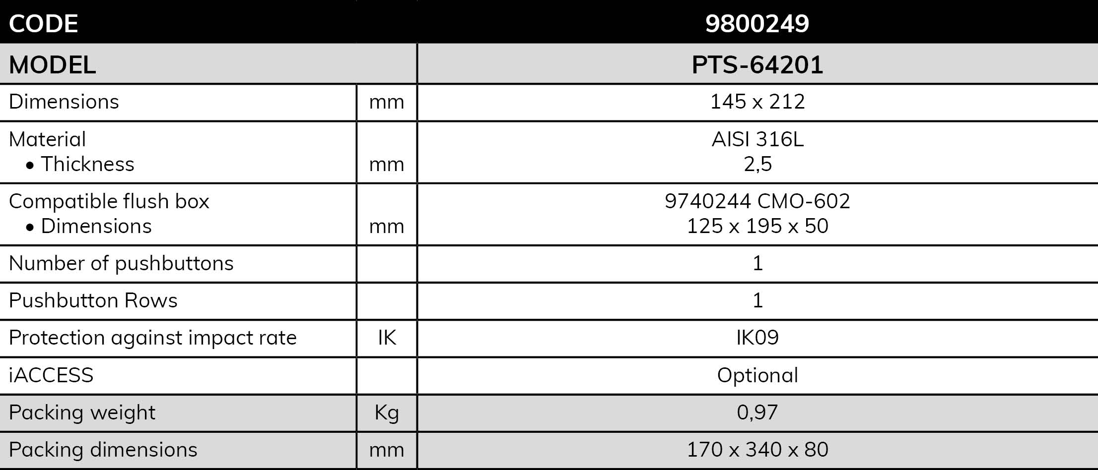 - Construction in stainless steel AISI316L 2,5 mm thickness, with special vandal proof screws.