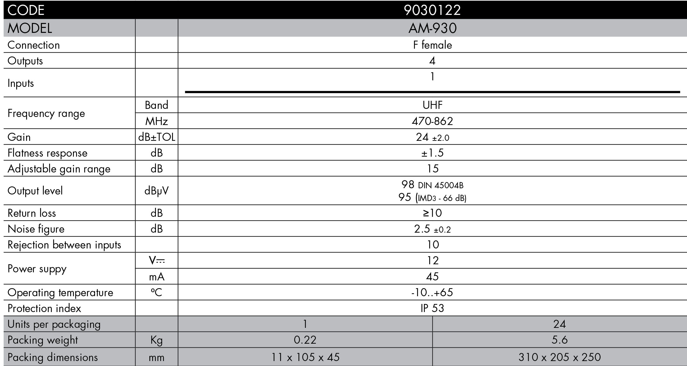 Individual digital and analogue terrestrial TV installations. Amplifies the signal from the antenna and distributes it to its outputs. The signal obtained at each output can be distributedt on one or several TV outlets.