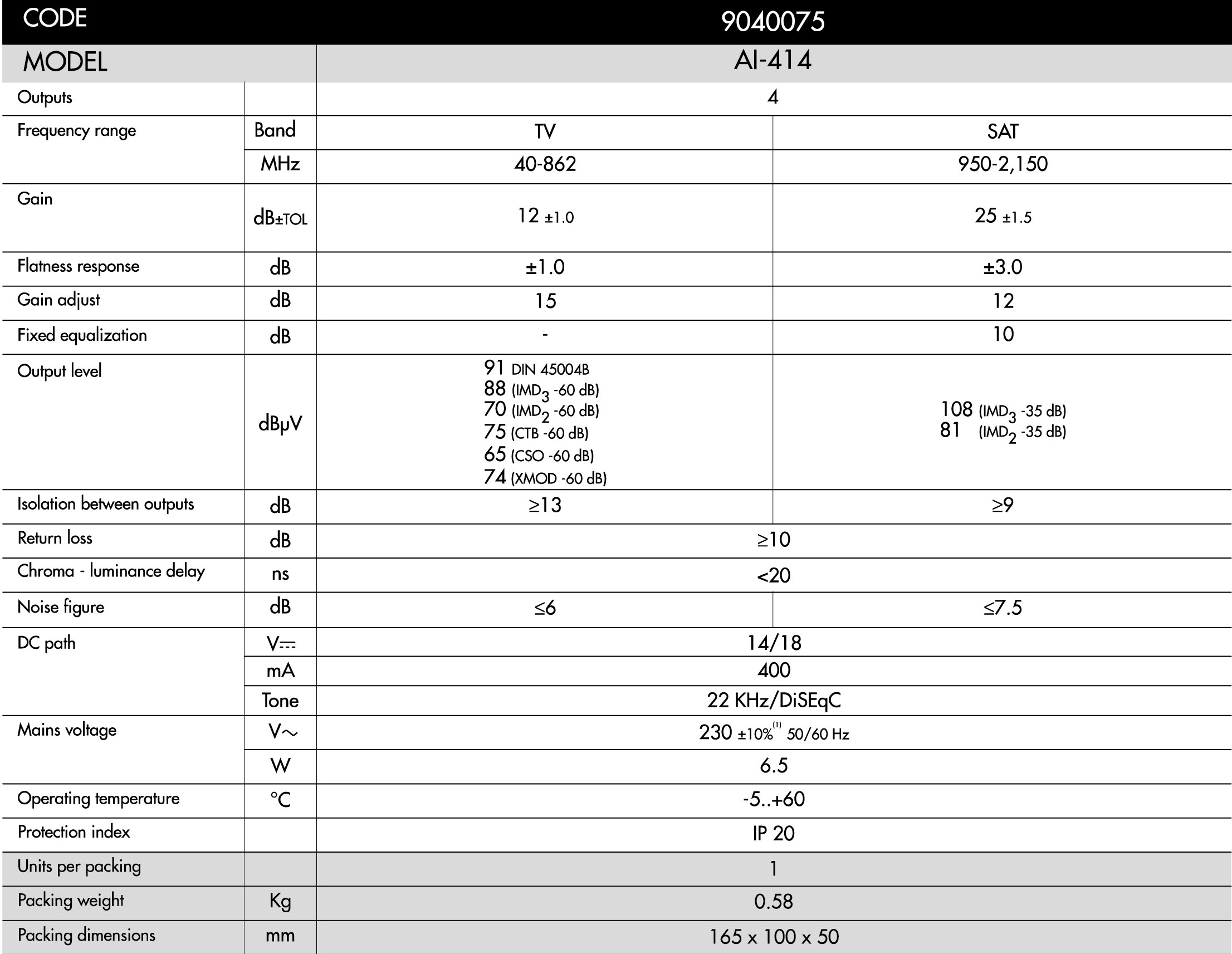 Made from ABS plastic, with an internal zamak chassis which gives maximum shielding. The power supply unit is insulated from the rest of the high frequency circuit. Fixed to the wall by means of the supplied screws and wall-plugs. F type connectors.