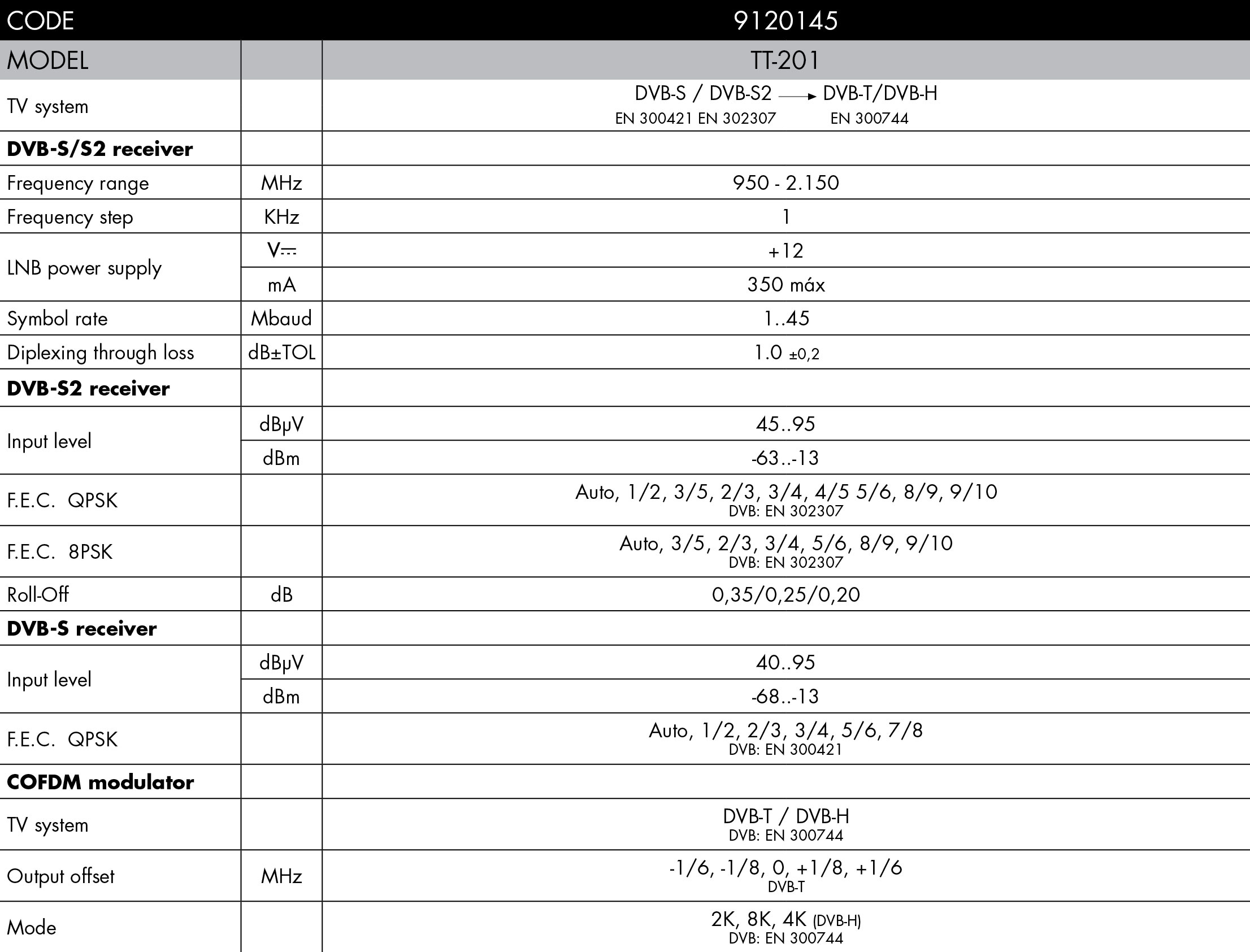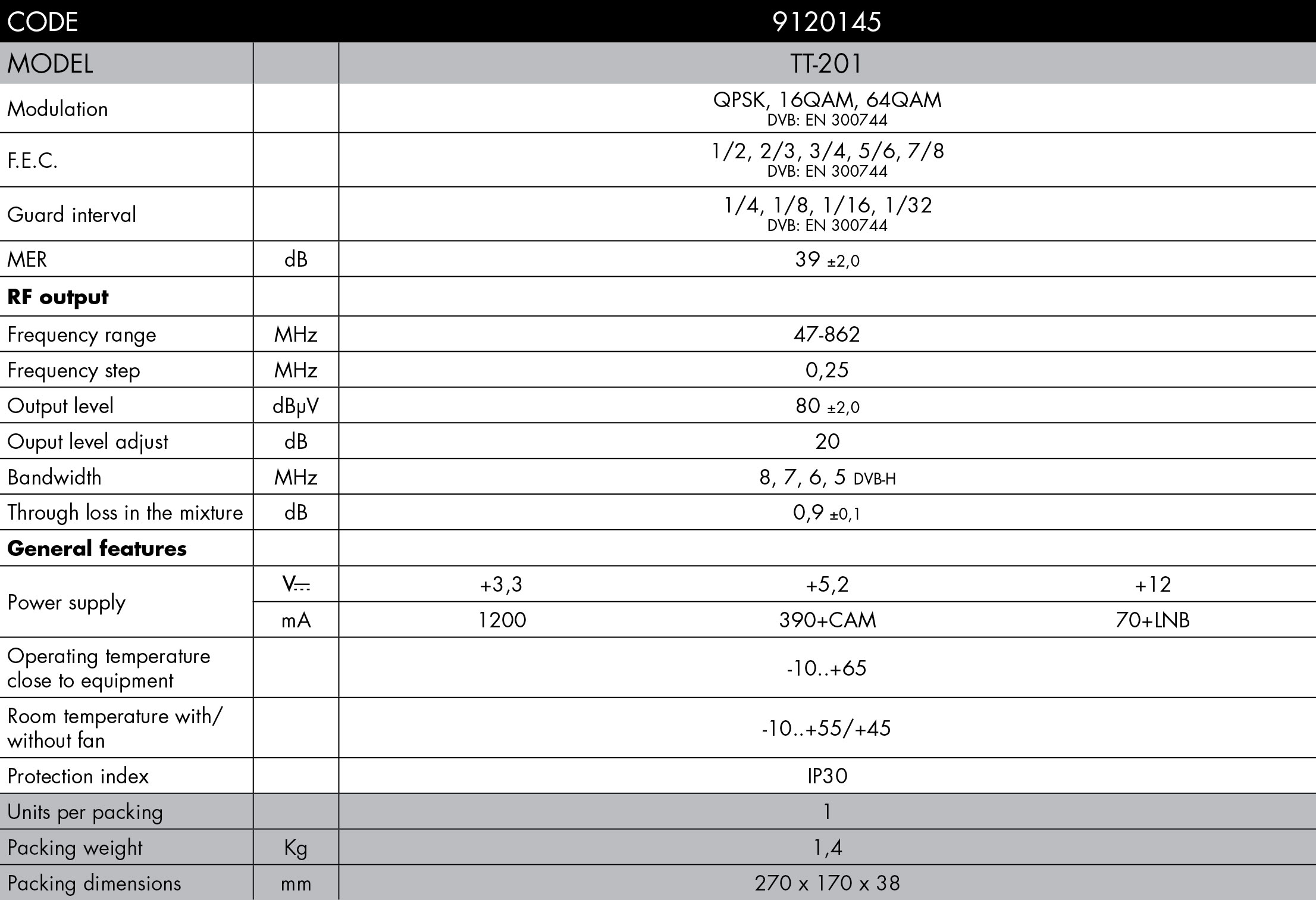 Transmodulator of unencrypted satellite digital television services to terrestrial digital television. Each module selects the free-to-air services of a DVB-S/S2 satellite transponder and includes them in a DVB-T channel. Programmable using PC software and a wireless programmer. Applications Collective terrestrial digital television installations where it is necessary to distribute FTA satellite television services while avoiding the installation of satellite receivers. Compatible with all collective TV installations since the channels can be distributed throughout the terrestrial band. Characteristics Automatic error-detection system which greatly reduces maintenance work on the installation. Generated output channel of outstanding quality. Zamak chassis with metal side panels. F-type connectors. The equipment can be assembled quickly and easily.