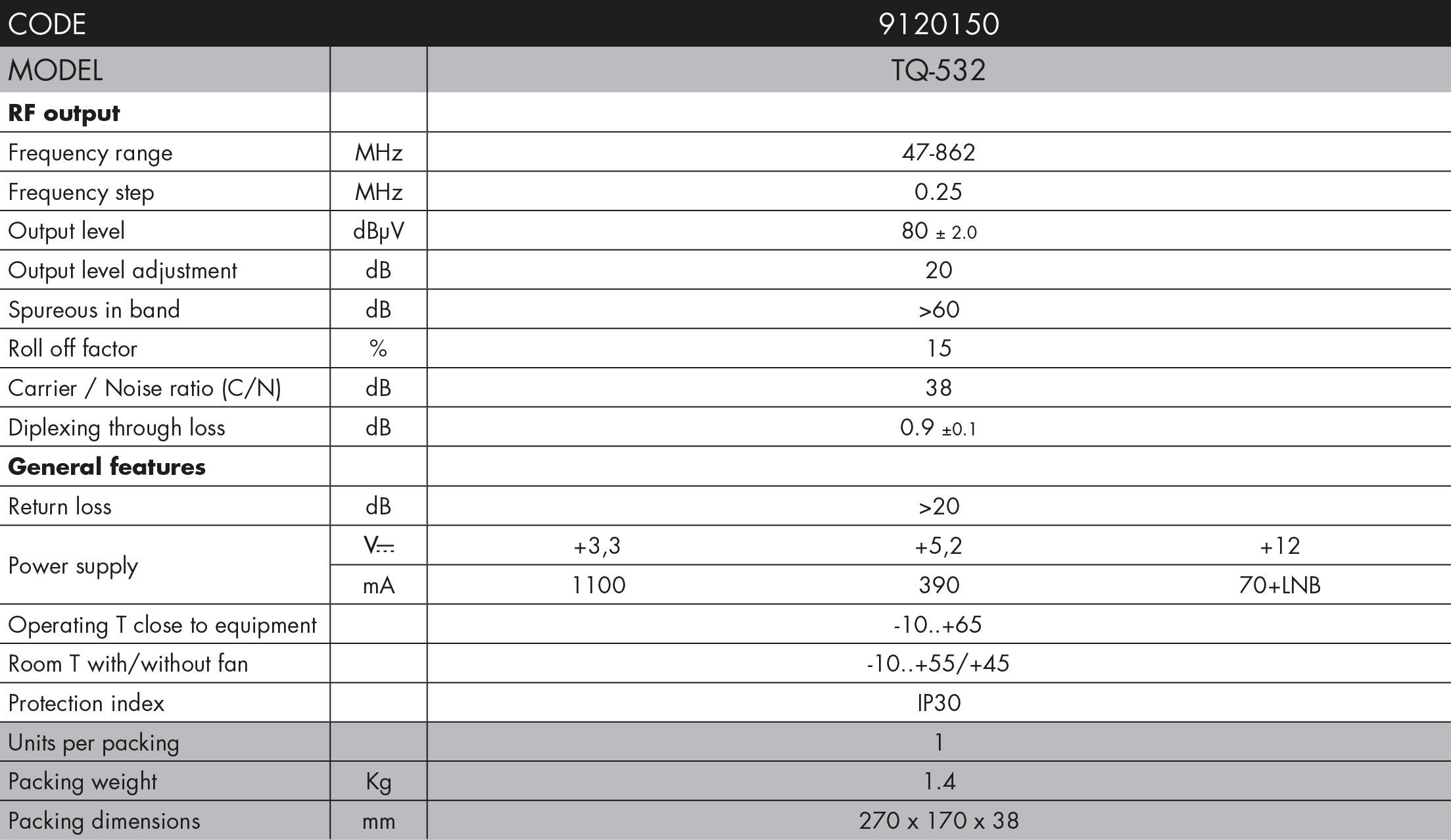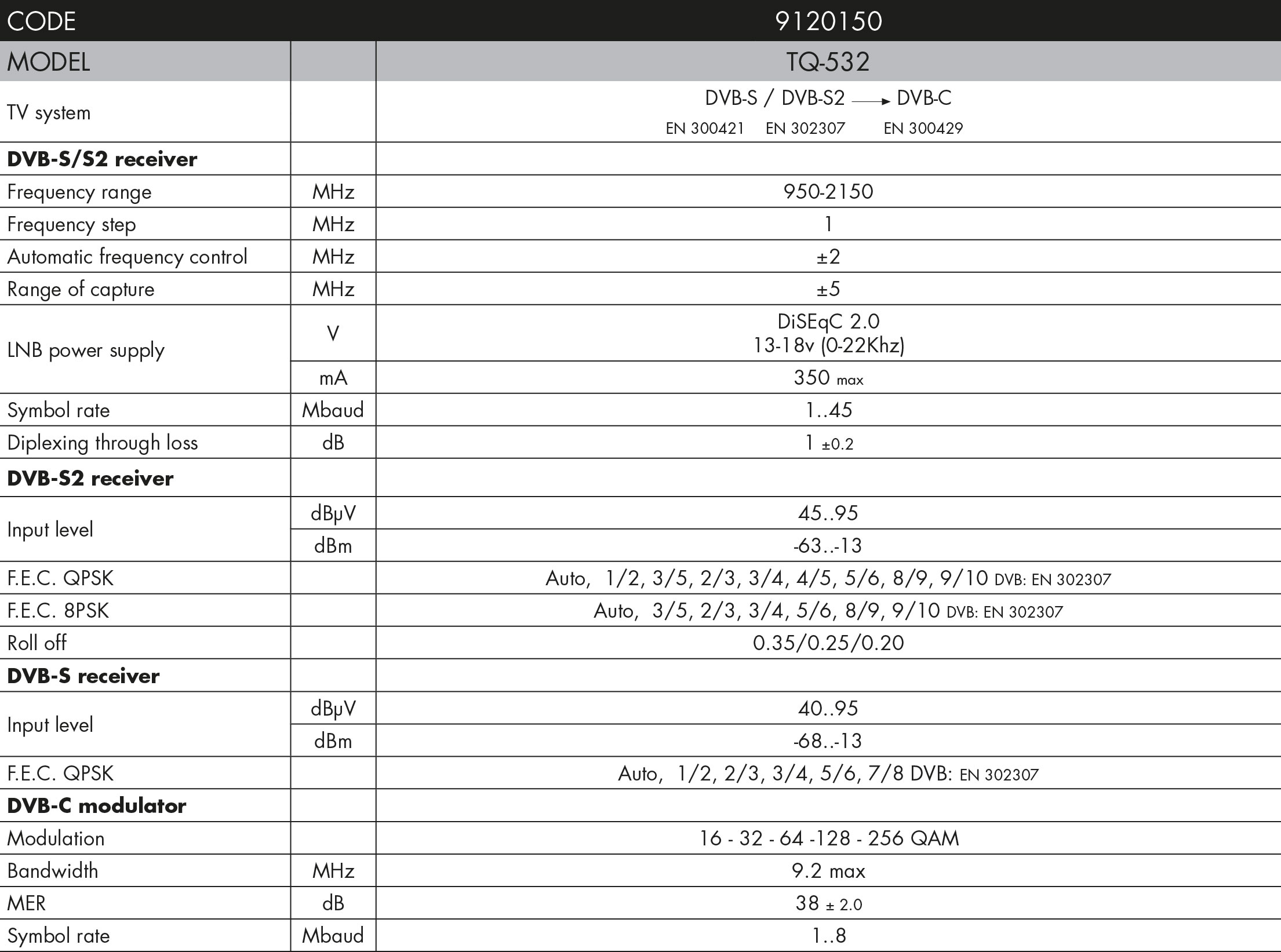 Automatic error-detection system which greatly reduces maintenance work on the installation. Generated output channel of outstanding quality. Zamak chassis with metal side panels. F-type connectors. The equipment can be assembled quickly and easily.
