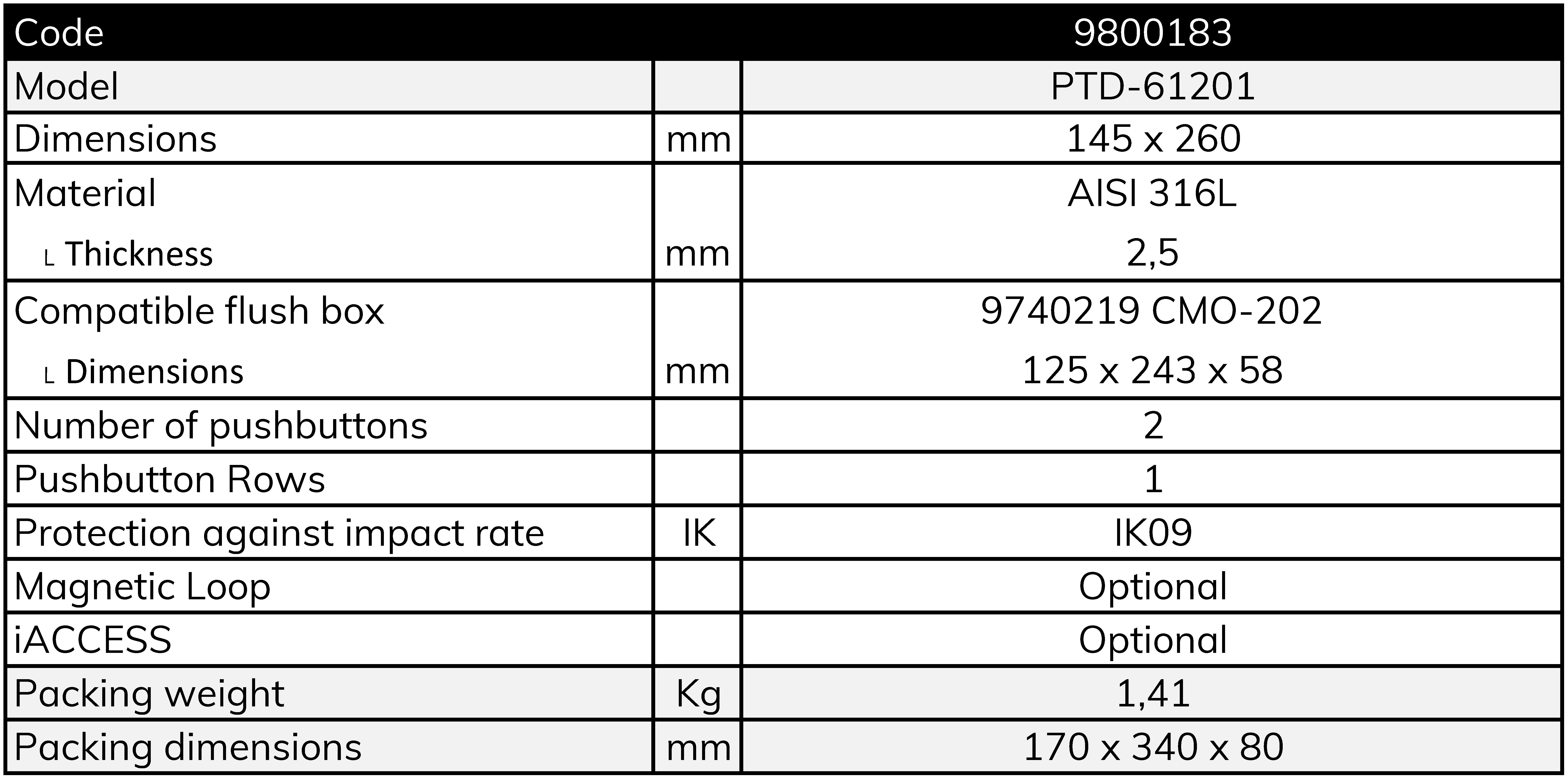 - Construction in stainless steel AISI316L 2,5 mm thickness, with special vandal proof screws.