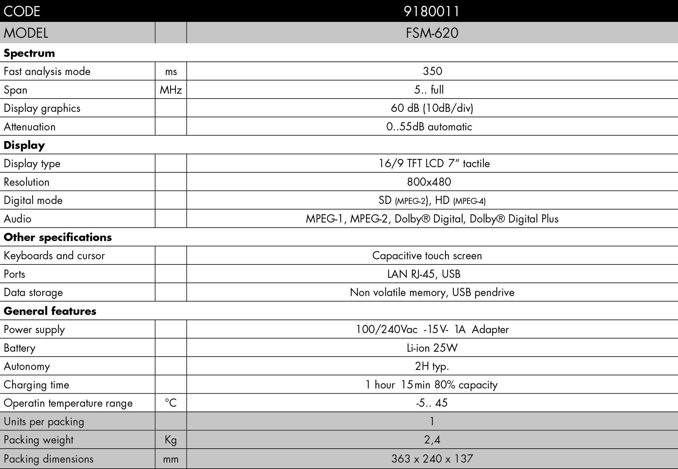 Measurement and analysis of terrestrial, satellite and cable TV installations, providing the necessary measurements for digital DVB-T/H, DVB-T2, DVB-S, DVB-S2, DVB-C and DVB-C2 signals, as well as analogue measurement in PAL, SECAM and NTSC. Graphic interface showing measurements and satellite dish pointing. Superfast spectrum analysis. Viewing of TV programmes in HD (MPEG-4 H.264). Allows channels to be loaded via its Ethernet and USB ports and saved.