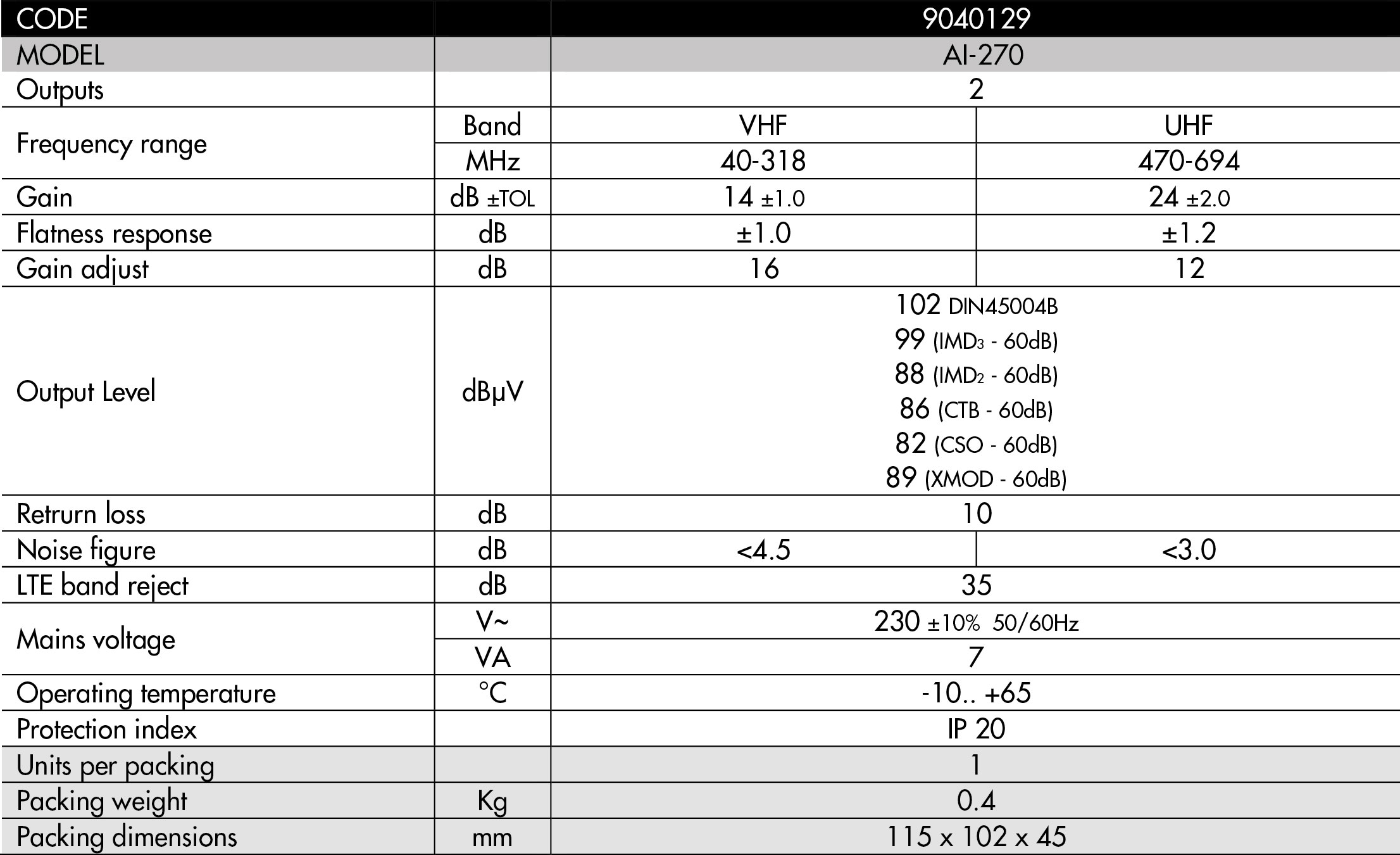 Made from ABS plastic, with an internal zamak chassis which gives maximum shielding. The power supply unit is insulated from the rest of the high frequency circuit, complying with the safety regulations for the installer and the user. Fixed to the wall by means of the supplied screws and wall-plugs. F type connectors.