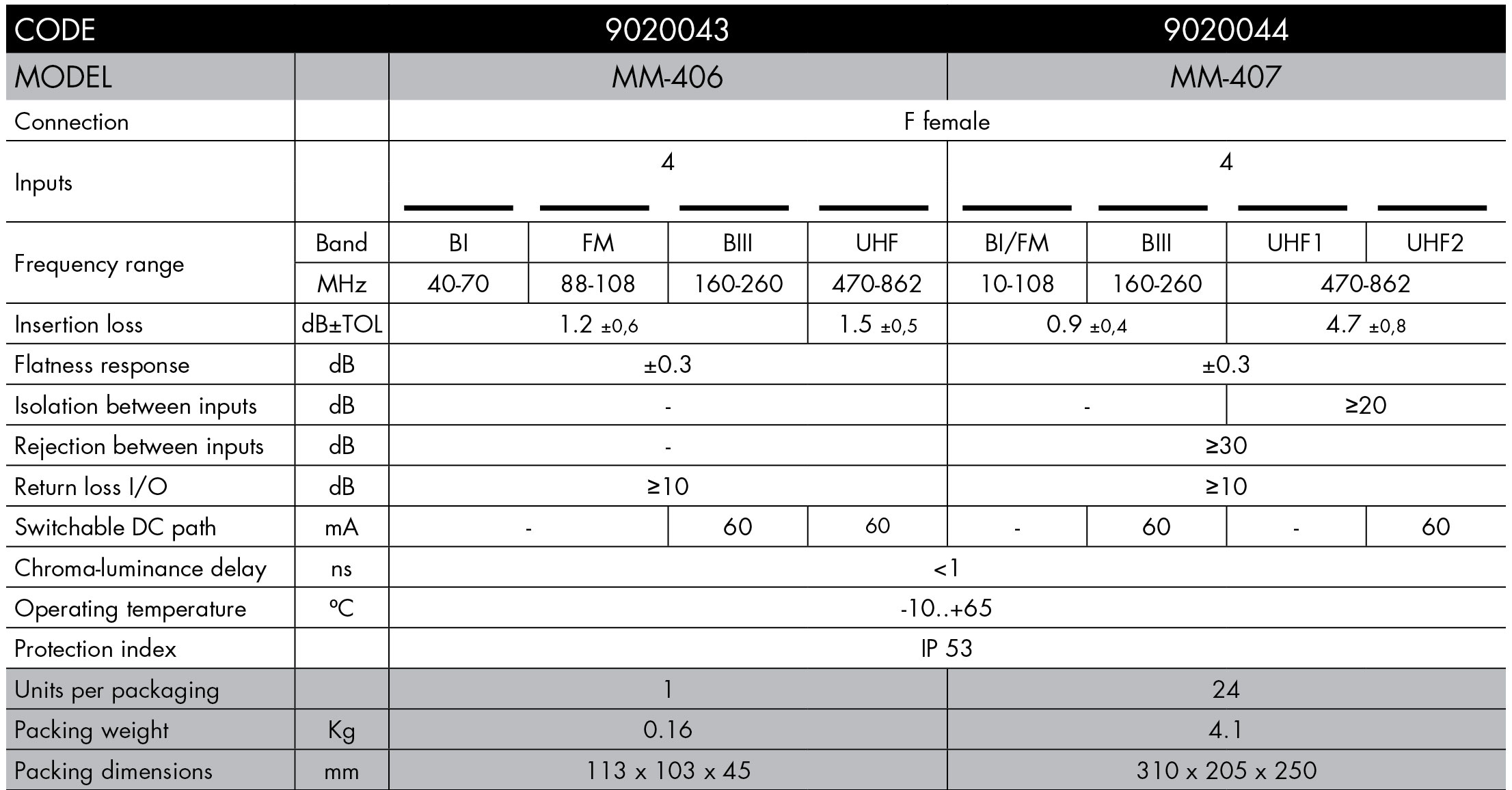 Multiplexers for masts for bands of four inputs. They mix the signals from several antennas into a single coaxial cable. They incorporate DC paths to permit the feeding of a preamplifier.