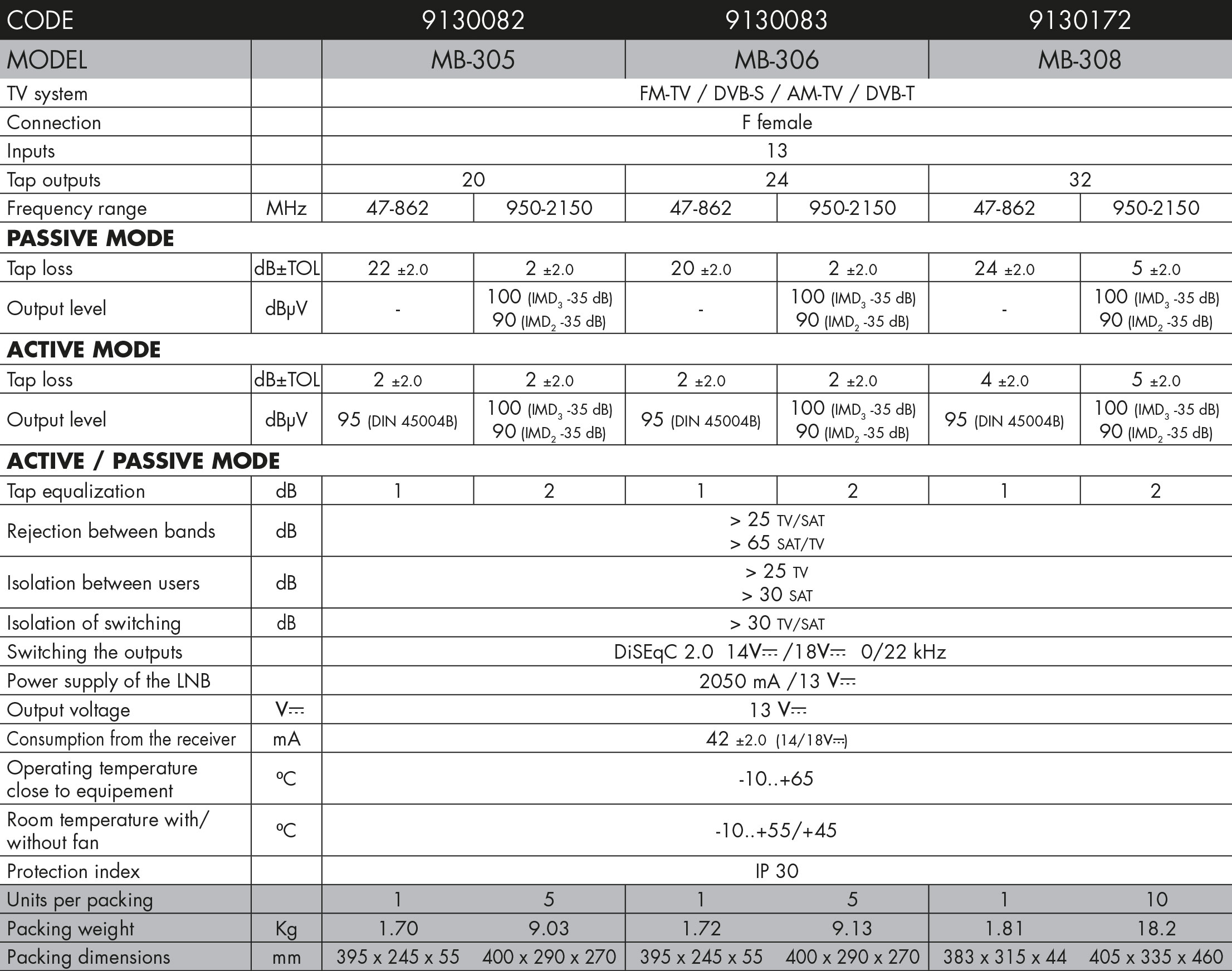 Final multiswitches for 12 polarities and terrestrial TV with 8, 12 and 16 outputs. The outputs are amplified in the satellite IF band. In the terrestrial band they can be configured to function in either active or passive mode. Need to be powered from each individual receiver so that the switching and the amplification of each derived output will function correctly. The external power supply units provide the required voltage to the LNBs for them to function properly.