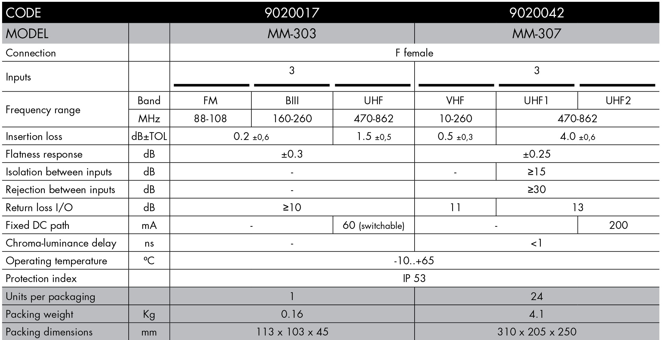 Multiplexers for masts, or by bands, of three inputs. They mix the signals from several antennas in a single coaxial cable.