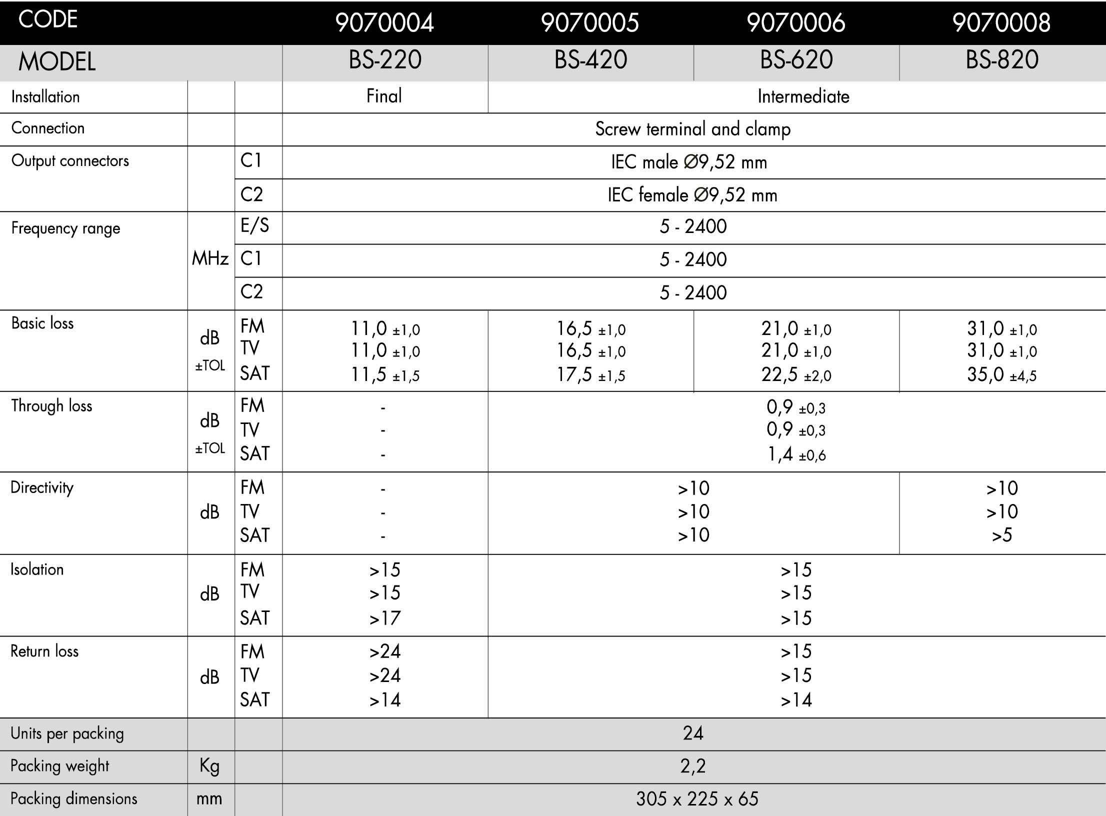Voltage blockage in the output connectors. Shielded zamak and metal plate chassis. Connection of the coaxial cable by means of screw terminal. Fits in a Ø60 mm box.