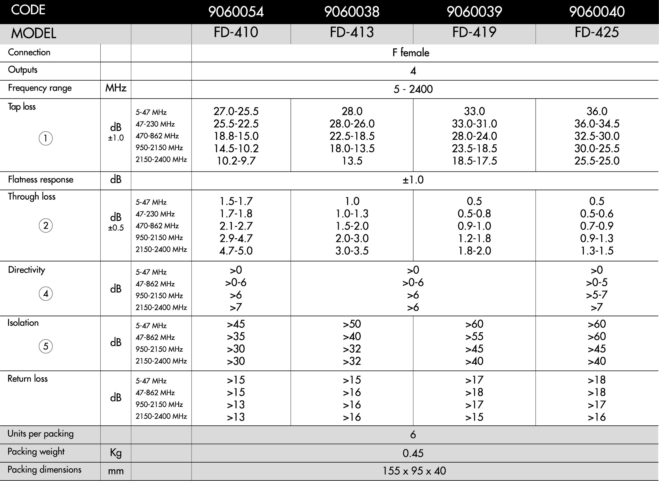 Equalised tap-offs for terrestrial and satellite TV with four tap outputs which cover the 5 to 2,400 MHz frequencies. They distribute part of the input signal to their tap outputs and the main part of the signal continues to the output. The equalisation of the tap outputs compensates the losses of the coaxial cable. Available in different tap-off attenuation values.