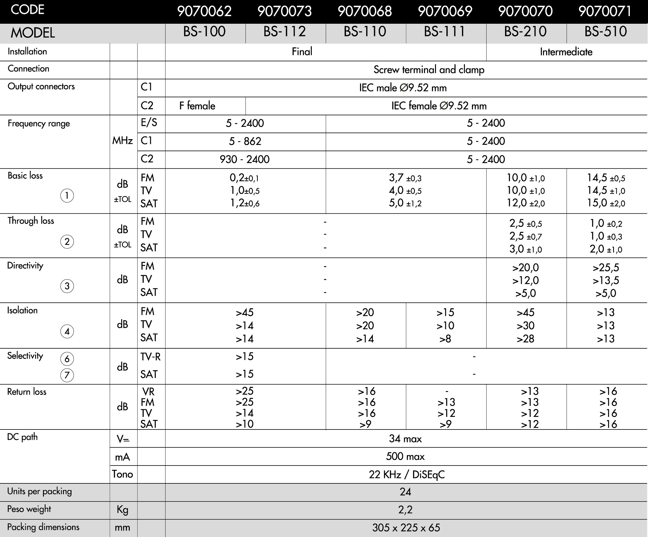 Outlets for terrestrial and satellite TV with two IEC male and female connectors (except for the BS-100 outlet). They cover frequencies up to 2,400 MHz. They have a DC path from one of their outputs to the input and from the through output in the intermediate outlets to the input.