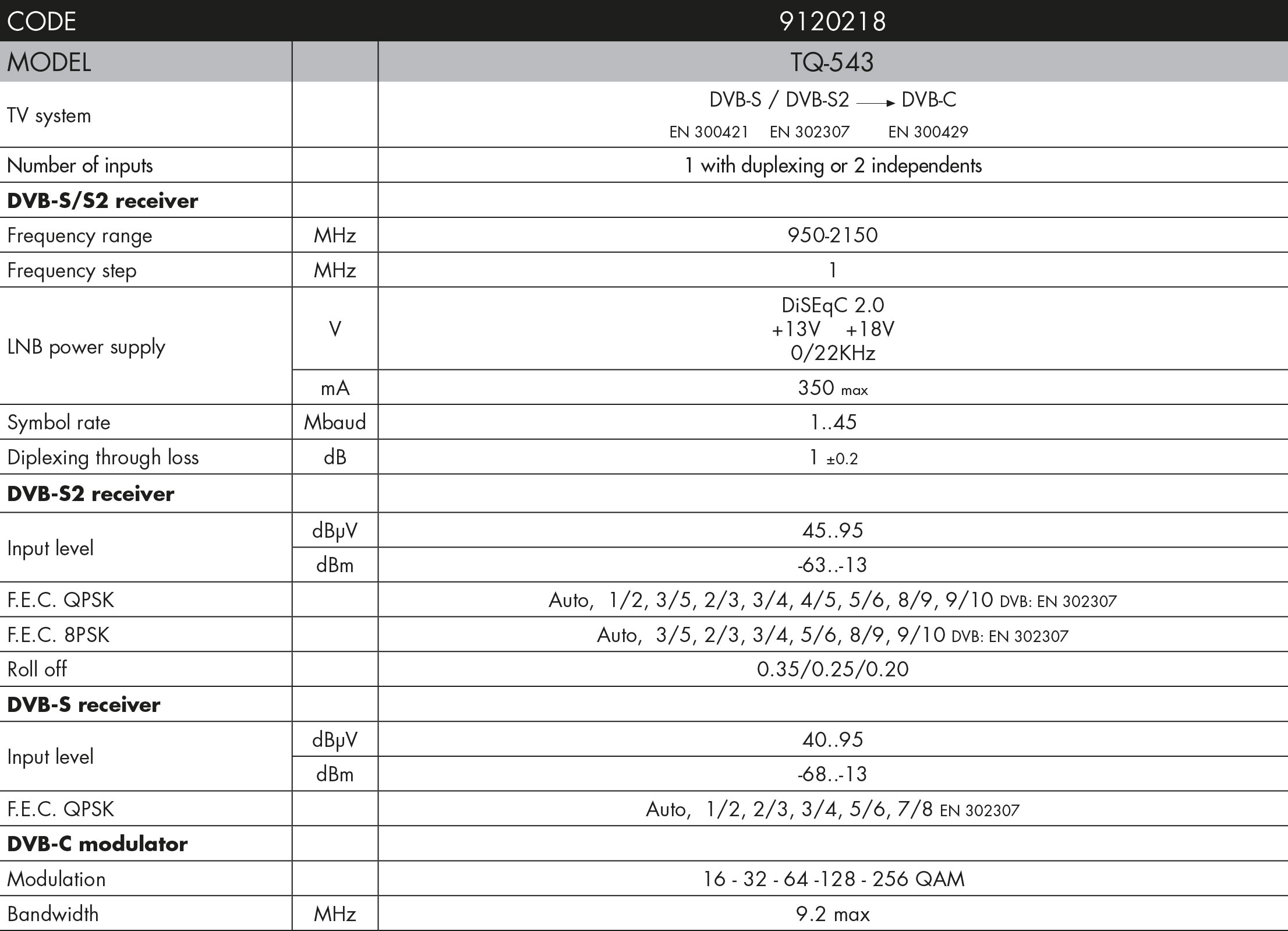 Two independents tuners. Automatic error-detection system which greatly reduces maintenance work on the installation. Generated output channel of outstanding quality. Does not include the CAM or the decoder card . Zamak chassis with metal side panels. F-type connectors. The equipment can be assembled quickly and easily.