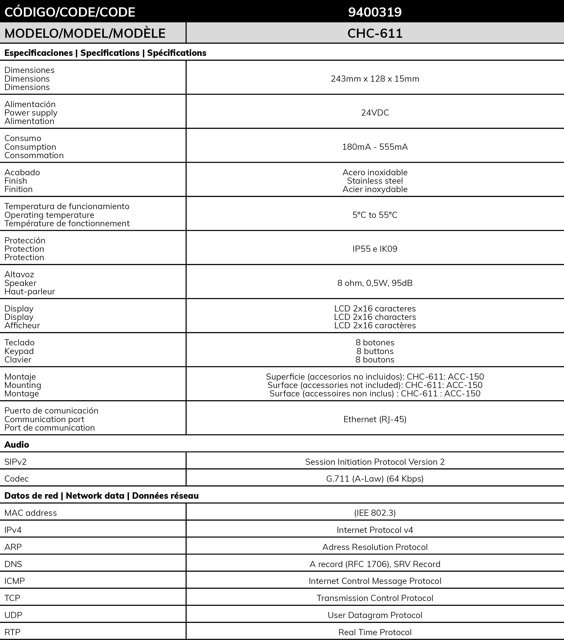Designed in stainless steel, giving it high resistance to external aggression, which along with its IP55 certification gives it the ideal characteristics to meet the durability and reliability needs required in unique buildings. Its mechanical design (ultra-slim) and robustness make it suitable for both surface mounting and recessed installation in the wall. The device's surface is compatible with aggressive cleaning products used for material disinfection in hospitals or other centers. It has a high-resistance backlit keyboard that allows staff to activate different types of calls and document tasks performed in the room, all without removing gloves. The panel features a help call (red), doctor call (blue), presence (green), and assistant presence (yellow). It also incorporates an LCD screen with information about the device's status, events, and active alarms in the room. Being based on VoIP technology and due to its connection to a data network via its RJ45 connector, it can intercommunicate with other room centers located in the same area, allowing the room to become an additional nursing control point while a nurse is present in the room.