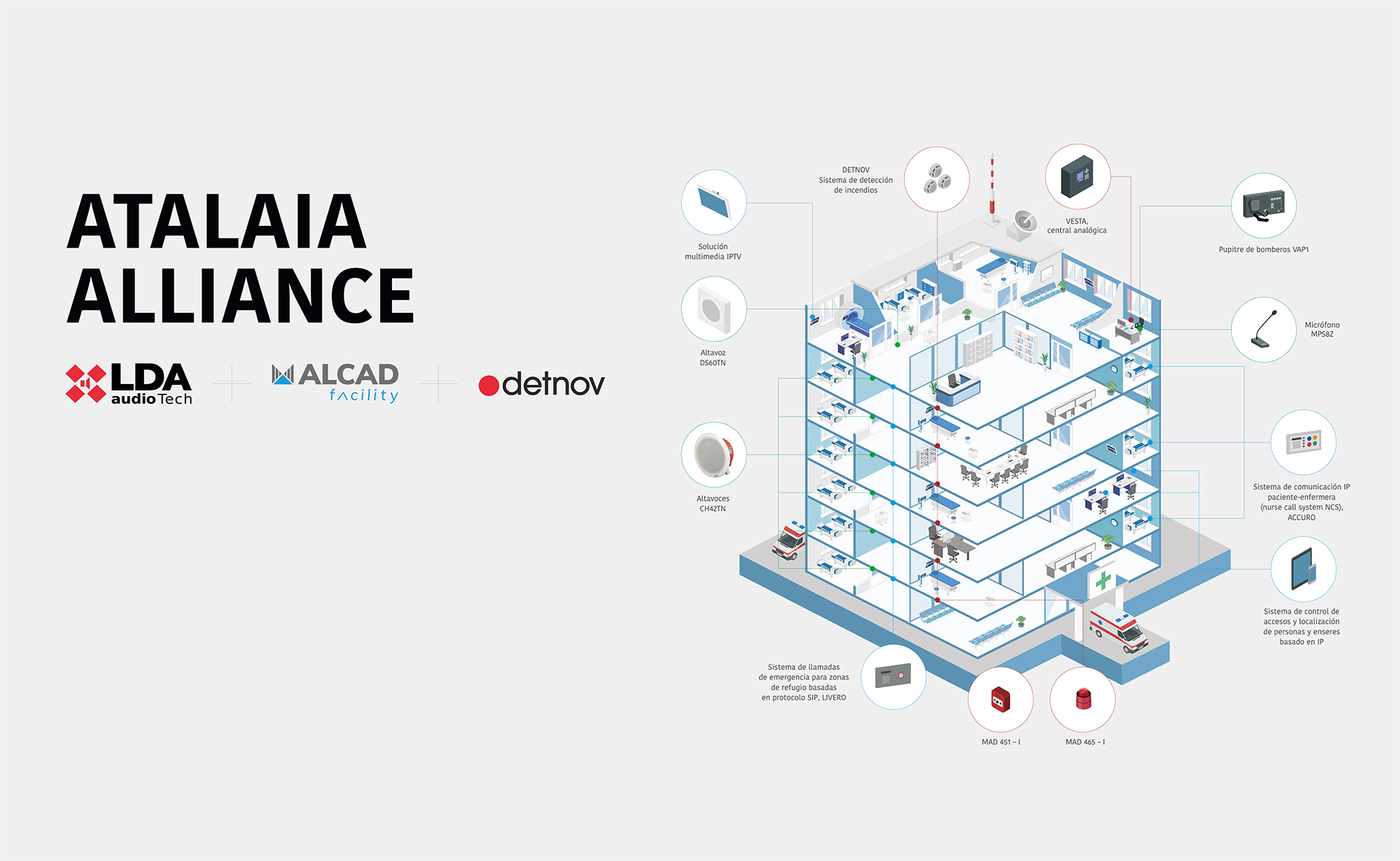 ALCAD Facility ha unido fuerzas con LDA Audio Tech y Detnov para crear un sistema unificado y de última generación en control de accesos, gestión de emergencias e incendios y evacuación. Con el nombre de Atalaia Alliance, esta integración ofrece la ventaja de contar con una plataforma que garantiza la seguridad en cualquier instalación, al mismo tiempo que se cumple con la normativa vigente en materia de detección, control y evacuación.