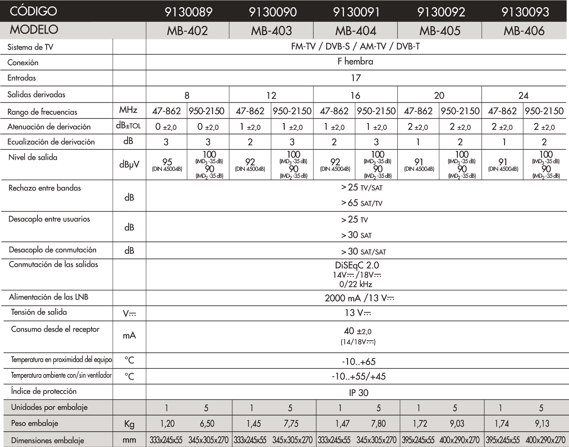 Multiconmutadores finales para 16 polaridades y TV terrestre con 8, 12 y 16 salidas. Las salidas están amplificadas en la banda de FI de satélite. En banda terrestre son configurables para que funcionen en modo activo o pasivo. Requiere de alimentación desde cada receptor individual para el funcionamiento de la conmutación y la amplificación de cada salida derivada. Los alimentadores externos proveen la tensión necesaria a las LNB para su funcionamiento.