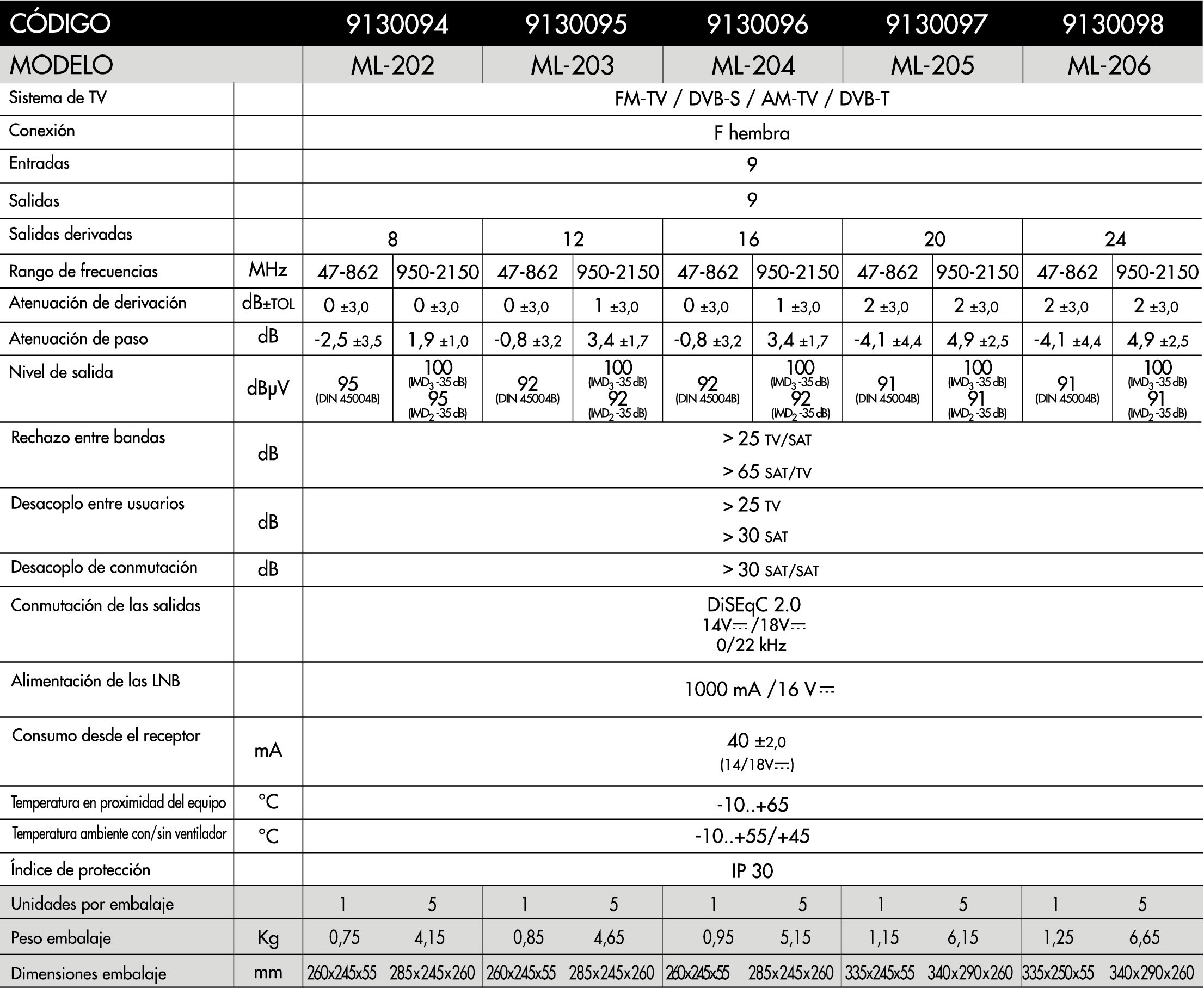 Multiconmutadores cascadables para 8 polaridades y TV terrestre con 8, 12 y 16 salidas. Las salidas están amplificadas en la banda de FI de satélite. En banda terrestre son configurables para que funcionen en modo activo o pasivo. Requiere de alimentación desde cada receptor individual para el funcionamiento de la conmutación y la amplificación de cada salida derivada.