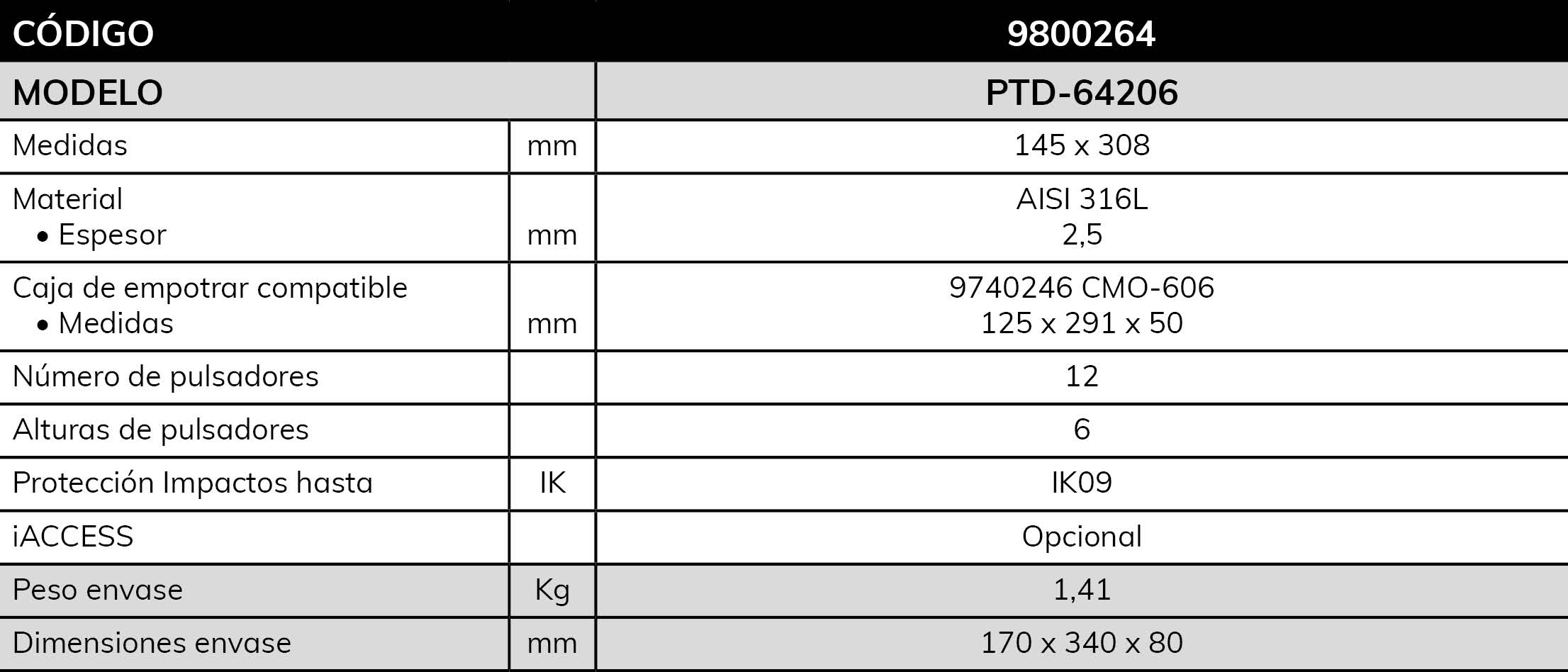 Placa de calle antivandálica para instalaciones de video portero 2 hilos. Incluye módulo tarjetero/lector iACCESS iluminado. Esta placa dispone de 12 pulsadores de llamada dispuestos en 2 columnas.