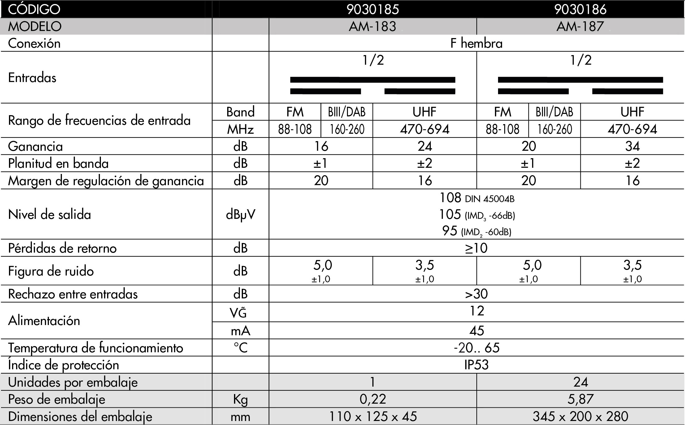 Amplificadores de banda ancha para mástil, compatibles con la emisión de señales de telefonía móvil LTE con banda de amplificación en UHF 470 - 694 MHz. Incluye un filtro de rechazo para LTE (694 MHz). Disponen de una o dos entradas para amplificar y combinar las señales procedentes de las antenas, pudiendo ser una sola entrada con las bandas combinadas o dos entradas con bandas separadas. Se alimentan a través del cable coaxial desde un alimentador instalado en el interior del edificio.