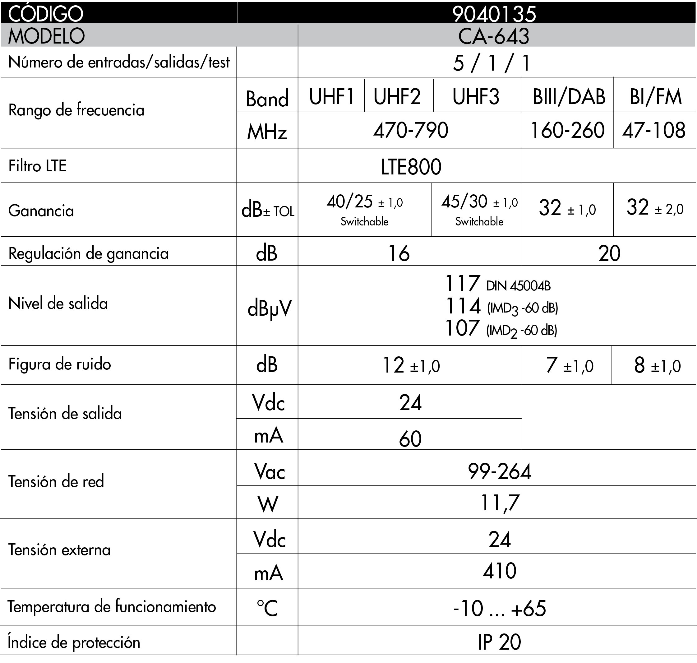 Instalaciones MATV digitales y analógicas a gran escala que se ven afectadas por la transmisión de señales de telefonía móvil LTE800. Adecuado para instalaciones donde los canales de cada banda se reciben en niveles similares. Ajuste mediante interruptores y reguladores que controlan la ganancia en cada entrada.