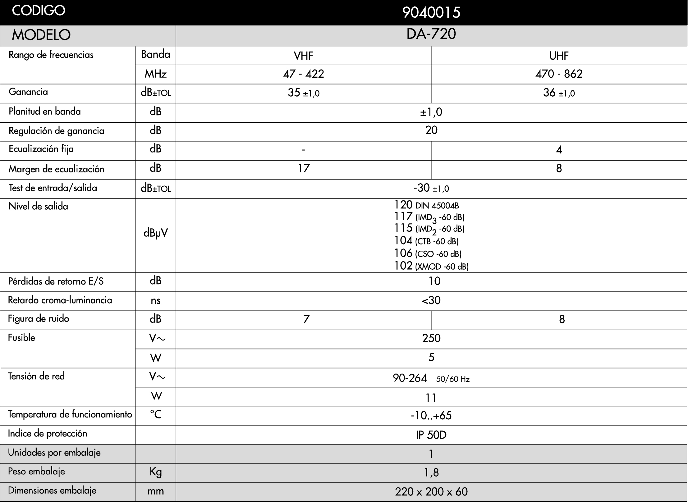 Amplificador de distribución de banda ancha para TV terrestre. Amplifica de modo separado las bandas de VHF más interbandas y la banda de UHF. Cada banda dispone de un regulador de ganancia y un ecualizador variable, que al ser independientes facilitan el ajuste de niveles. Se alimenta con una fuente de alimentación incorporada.
