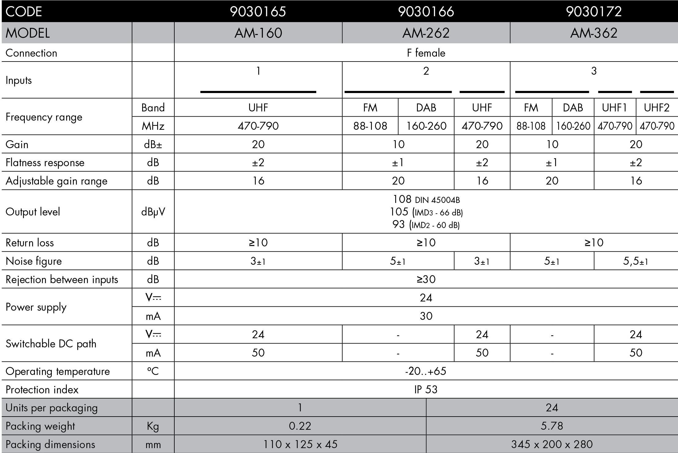 Amplificadores de banda ancha para mástil, compatibles con la emisión de señales de telefonía móvil LTE con banda de amplificación en UHF 470 - 790 MHz. Incluye un filtro de rechazo para LTE. Disponen de una, dos o tres entradas para amplificar y combinar las señales procedentes de las antenas. Se alimentan a través del cable coaxial desde un alimentador instalado en el interior del edificio. Incorporan pasos de corriente conmutable para permitir la alimentación de un preamplificador.