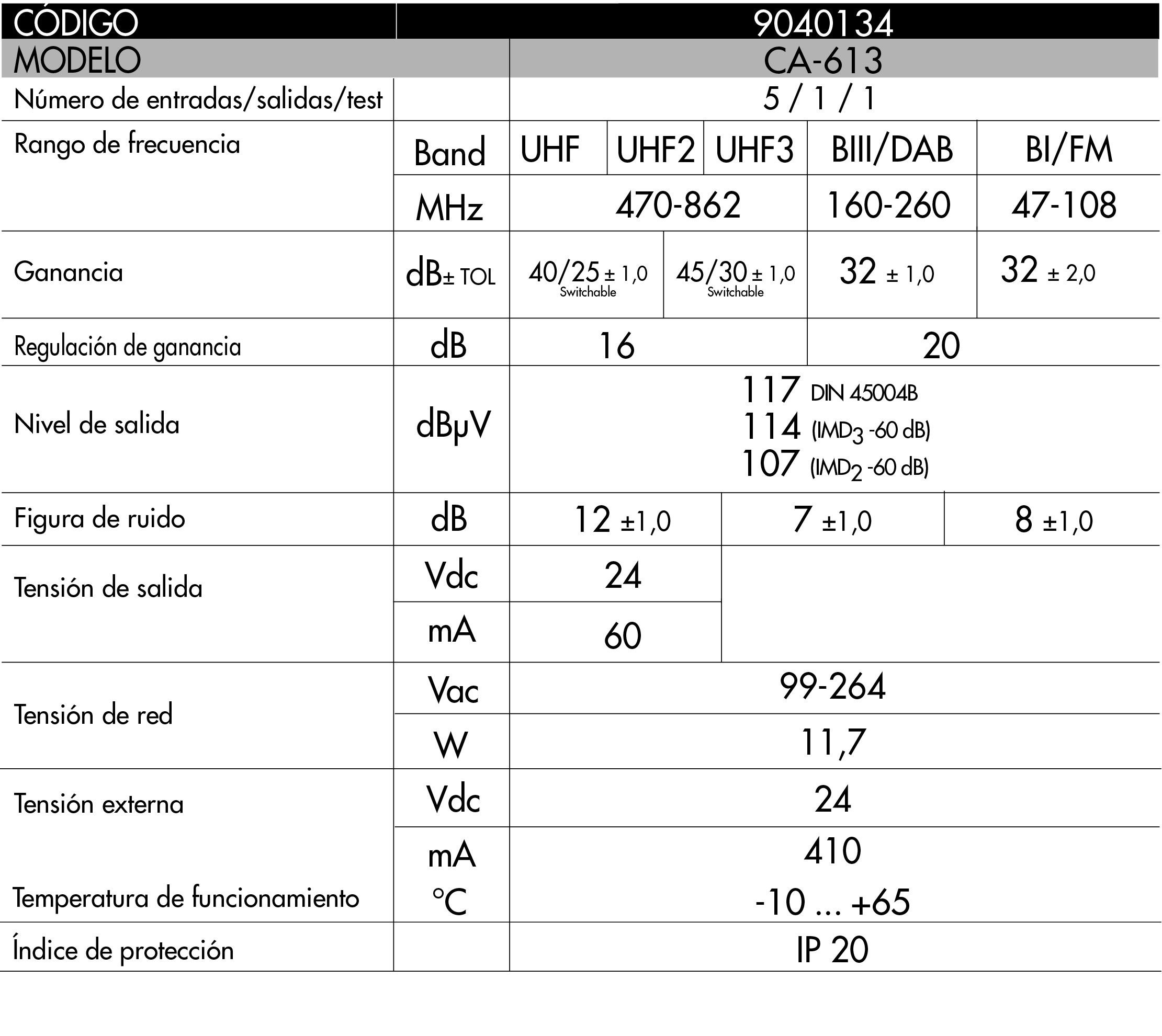 Amplificador de banda ancha para cabecera, con cinco entradas y diferentes configuraciones de frecuencia. La unidad de fuente de alimentación incorporada puede alimentar a un preamplificador por medio de un interruptor. Fuente de alimentación externa opcional para energía redundante. Punto de prueba de salida para ajustar la instalación sin tener que desconectar la señal de TV.