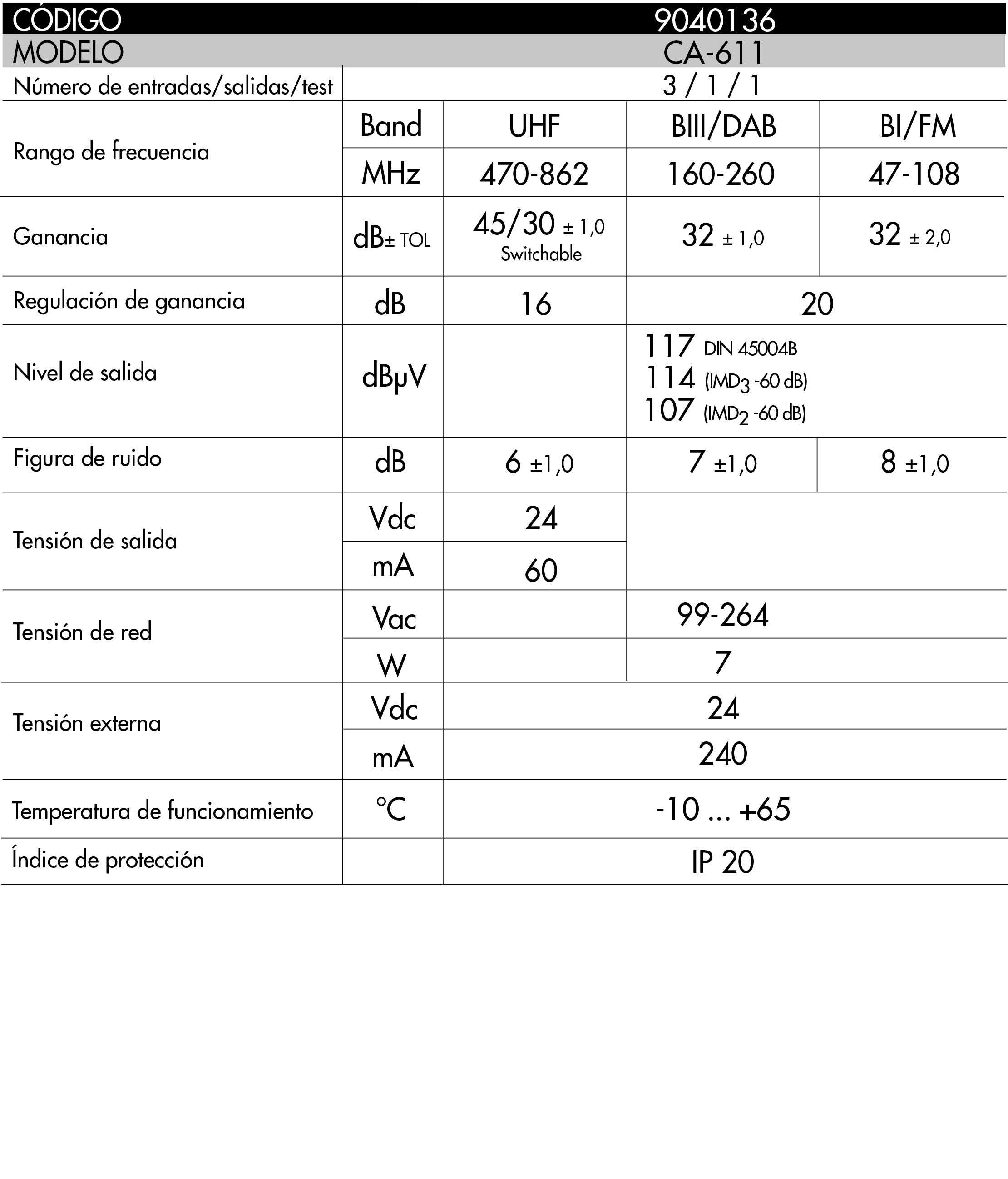 Amplificador de banda ancha para cabecera, con tres entradas y diferentes configuraciones de frecuencia. La unidad de fuente de alimentación incorporada puede alimentar a un preamplificador por medio de un interruptor. Fuente de alimentación externa opcional para energía redundante. Punto de prueba de salida para ajustar la instalación sin tener que desconectar la señal de TV.