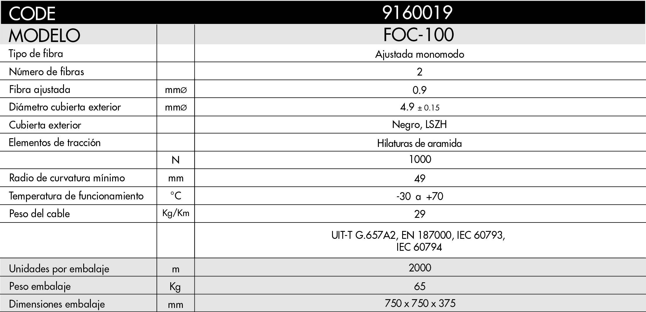 Cable de 2 fibras ópticas monomodo ajustadas para exterior tipo G.657A2. Cubierta exterior LSZH de color negro. Dispone de cable monotubo interno para proteger las 2 fibras ópticas. Elevada protección contra tracciones y torsiones gracias a su recubrimiento interior con hilaturas de aramida. Incluye guía de nylon interior para facilitar la instalación.