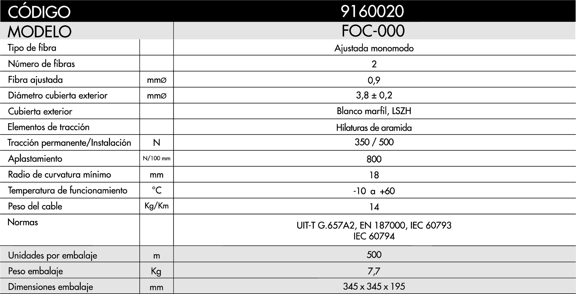 Cable de 2 fibras ópticas monomodo ajustadas para interior tipo G.657A2. Recubrimiento LSZH. Cable monotubo que protege las 2 fibras ópticas. Protección contra tracciones y torsiones gracias a su guía interior de nylon y al recubrimiento interior con hilaturas de aramida.
