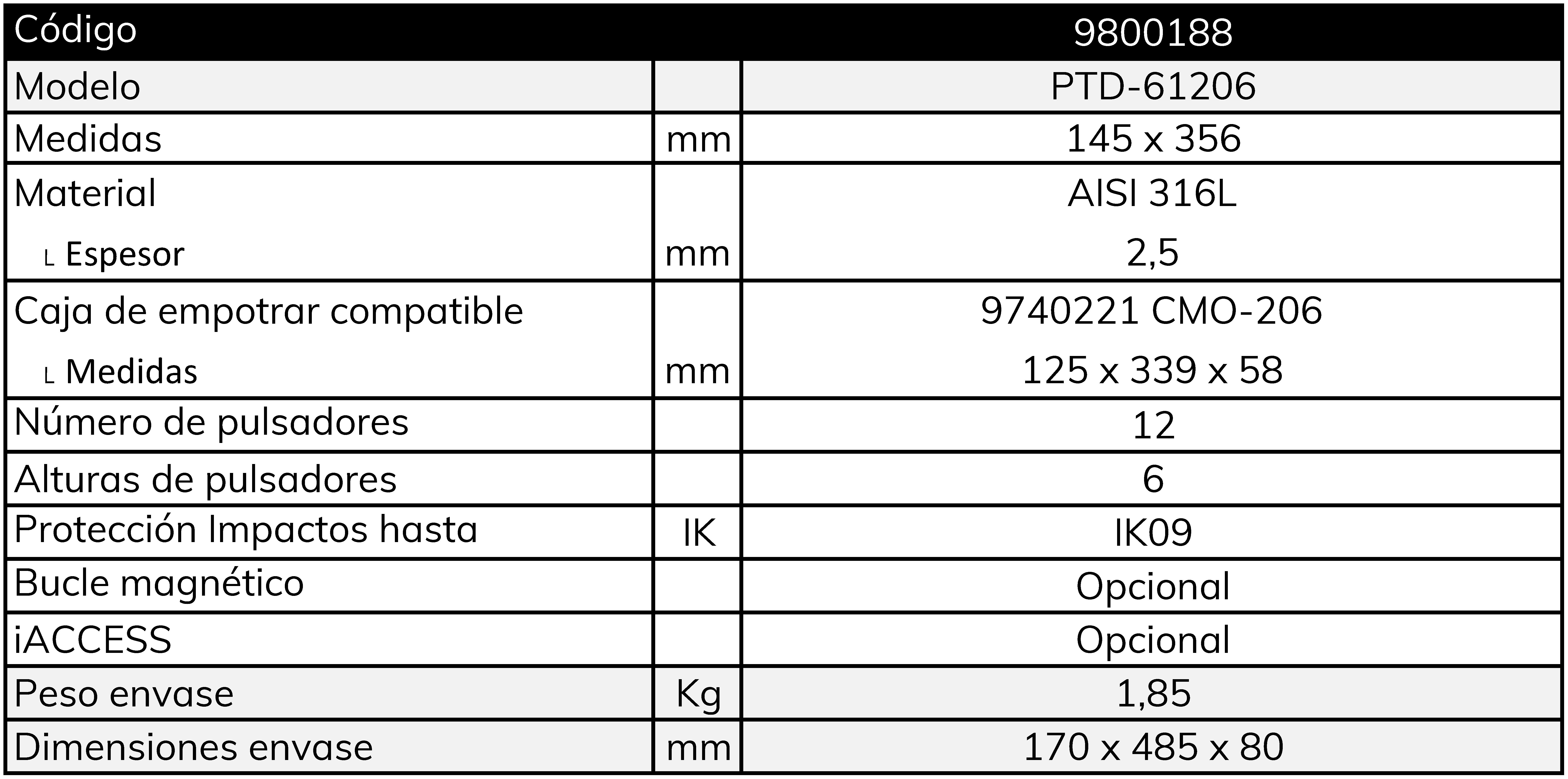 Placa de calle antivandálica para instalaciones de video portero 2 hilos. Incluye módulo tarjetero/lector iACCES iluminado. Esta placa dispone de 12 pulsadores de llamada dispuestos en 2 columnas.