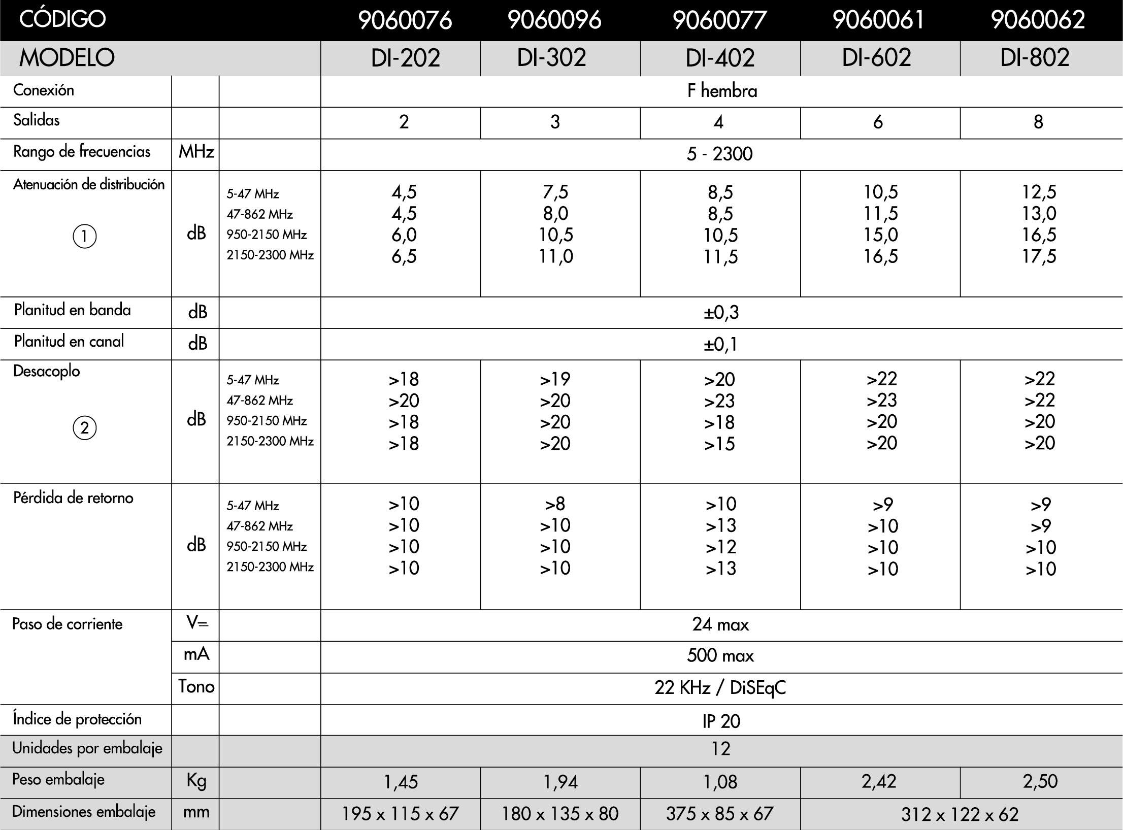 Distribuidores para TV terrestre y satélite que cubren las frecuencias de 5 a 2.300 MHz. Reparten a partes iguales toda la señal de entrada entre sus salidas. Permiten el paso de una tensión de alimentación a través de cualquiera de sus salidas hasta la entrada. La respuesta de las salidas es plana. Disponibles en 2, 4, 6 y 8 salidas.