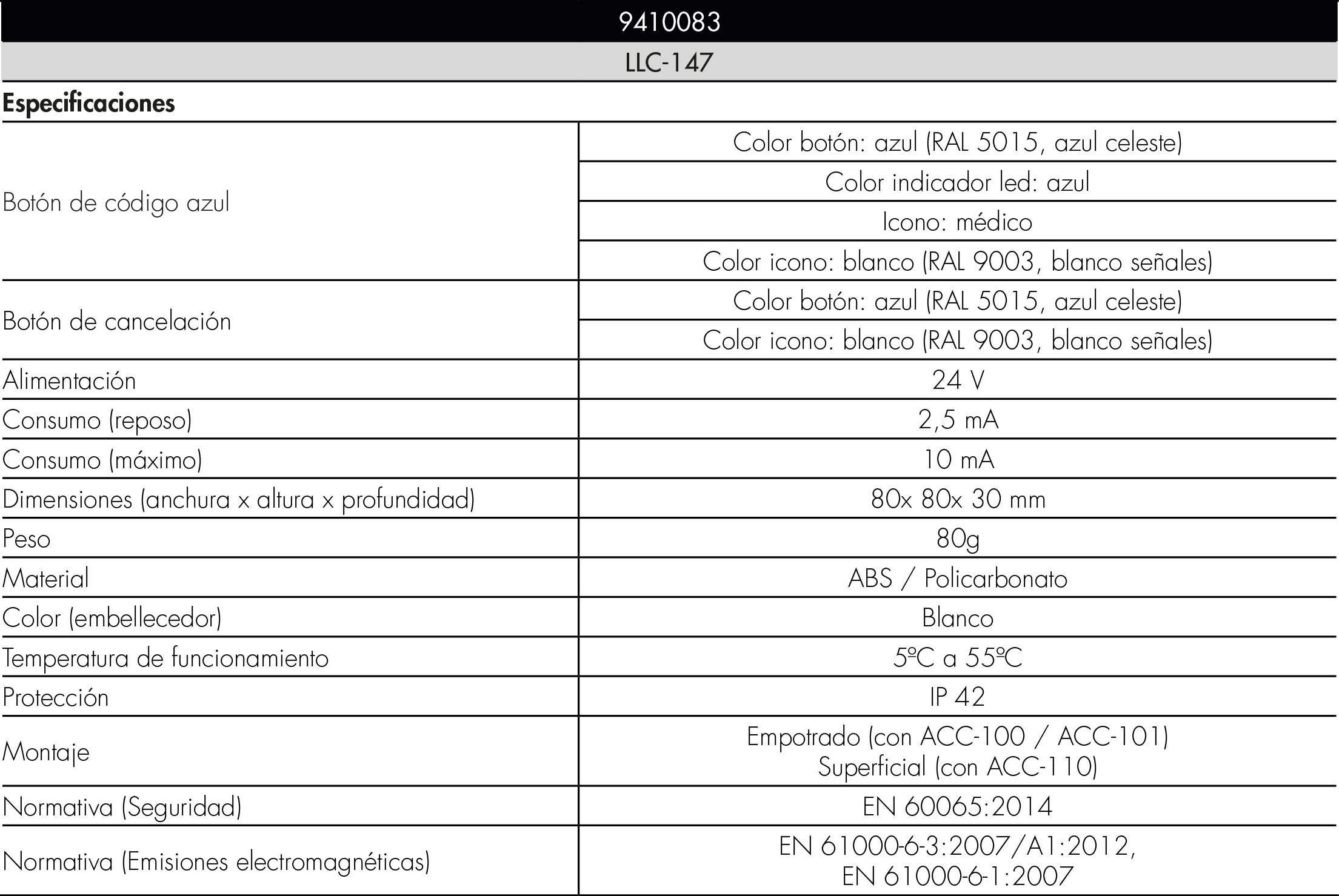 Periférico de habitación con pulsador de llamada a médico con indicador LED azul y pulsador de cancelación. Permite lanzar una llamada de código azul desde el pulsador de llamada azul. Una vez iniciada la llamada, el indicador LED azul permite una fácil identificación del lugar desde el que ha sido lanzada la llamada. Permite la cancelación de la llamada desde el pulsador de cancelación. Montaje empotrado o superficial.