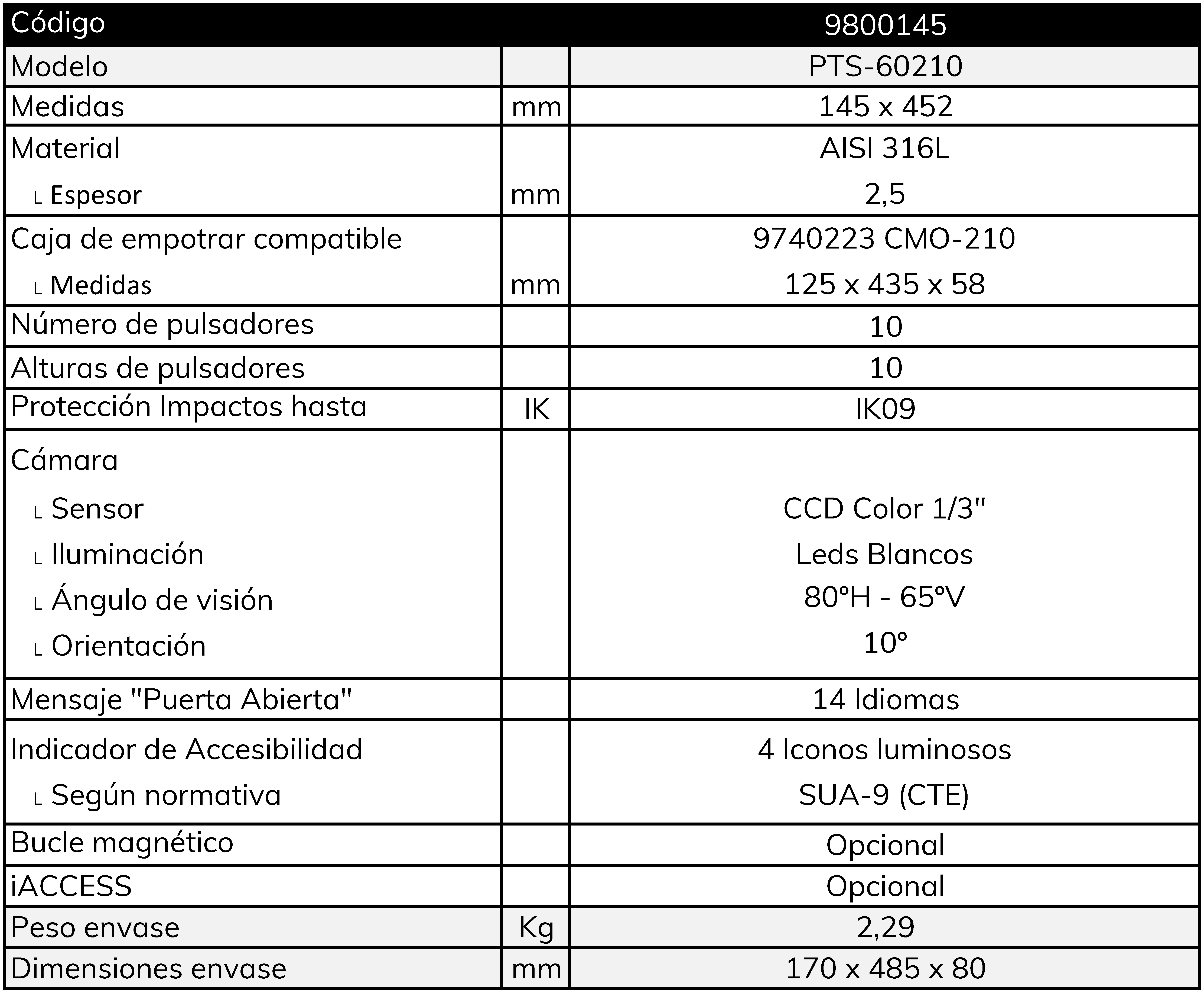 - Construcción en acero inoxidable AISI 316L con espesor 2,5 mm, con tornillos especiales antivandálicos. - Superficie 100% plana, sin resaltes. - Tarjeteros y protectores de cámara e iconos de accesibilidad de 6mm de espesor. - Protección contra golpes e impactos hasta el grado IK09 - Acabado estético atractivo y profesional Made in Spain. - Opción de personalización con nombre del edificio / dirección / información del instalador. - Módulo de accesibilidad con sintetizador de voz con 14 idiomas seleccionables para mensaje de ''puerta abierta''. Incluye posibilidad de silenciarlo. - iACCESS opcional. Comodidad y distinción para los propietarios e inquilinos.