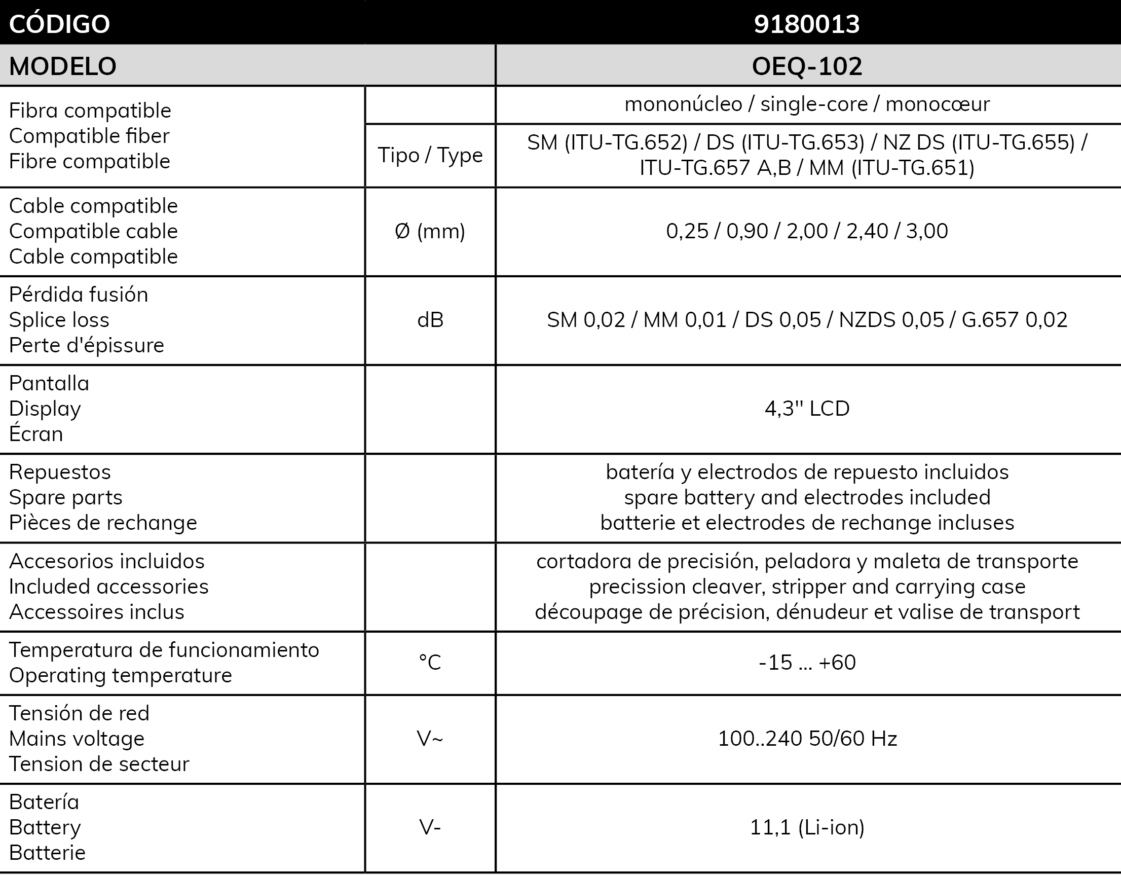La fusionadora es compatible con cables de fibra mononúcleo y distintos diámetros de cable, desde 0,25 mm hasta 3,00 mm. Las dos baterías incorporadas, de facil intercambio, permiten hacer hasta 400 ciclos de calentado y fusión con una sola carga. La fusionadora incorpora una pantalla LCD táctil de 4,3' abatible.