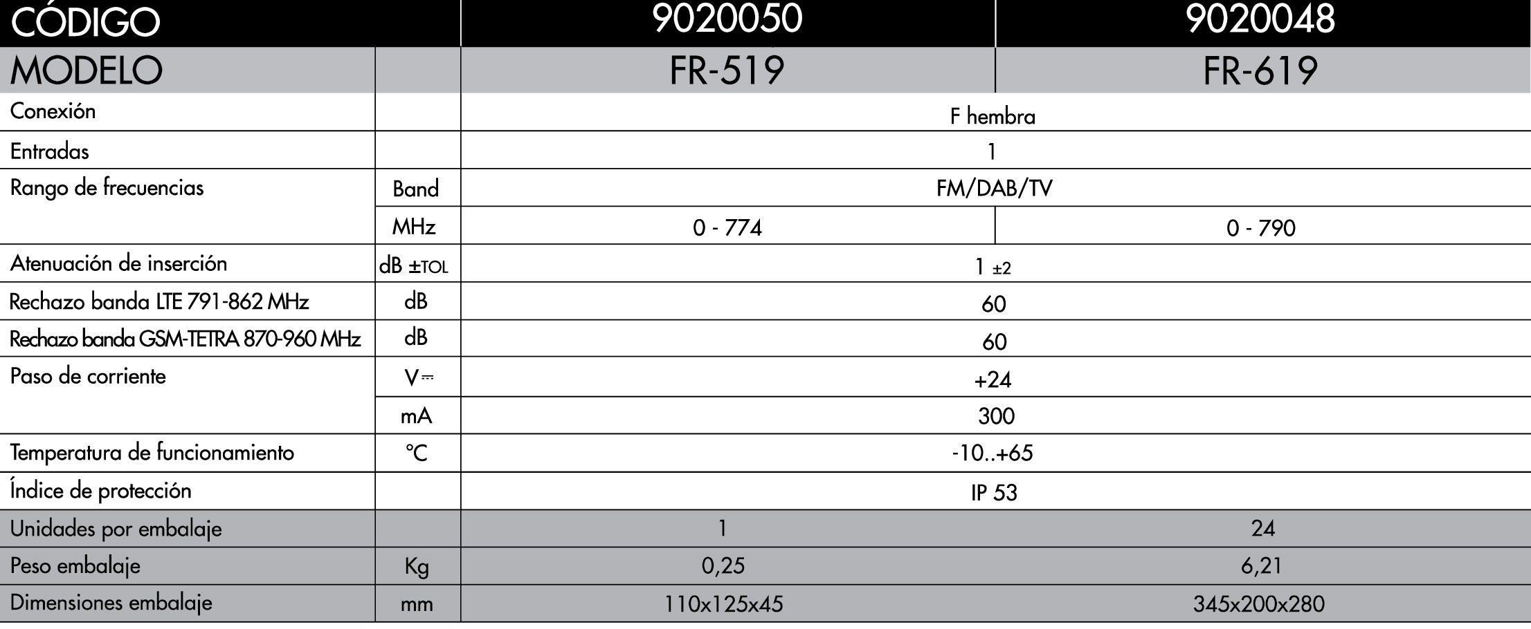 Filtro de rechazo para mástil, que permite el paso de los canales 21 a 58 y corta la interferencia de las señales de los teléfonos móviles LTE800, GSM y TETRA. Incorpora un paso de corriente que permite el suministro de potencia a un preamplificador.