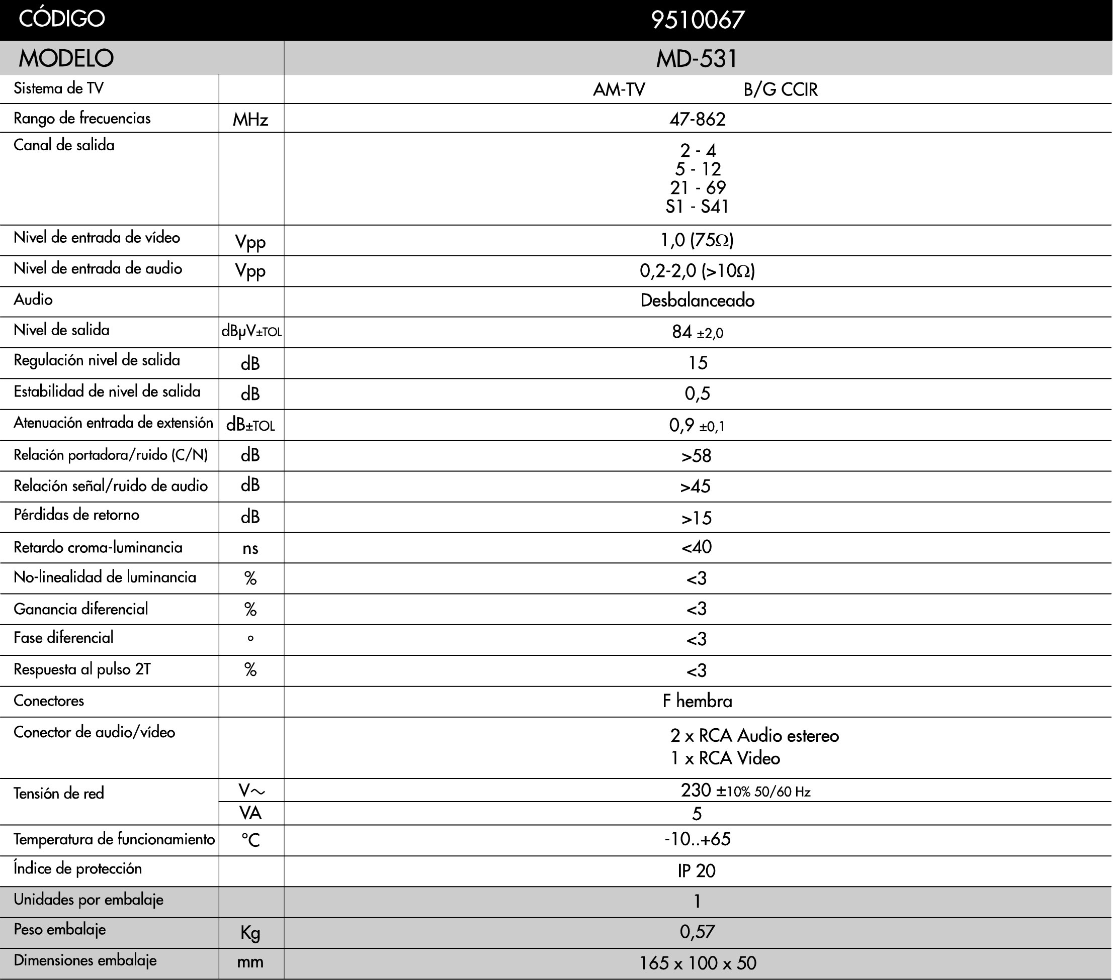Modulador de TV con audio mono, que a partir de las señales de audio y video genera un canal de TV analógico. El canal generado se mezcla con el resto de canales de la instalación de TV. Disponible en diferentes bandas, con diferentes normas y tablas de canales.