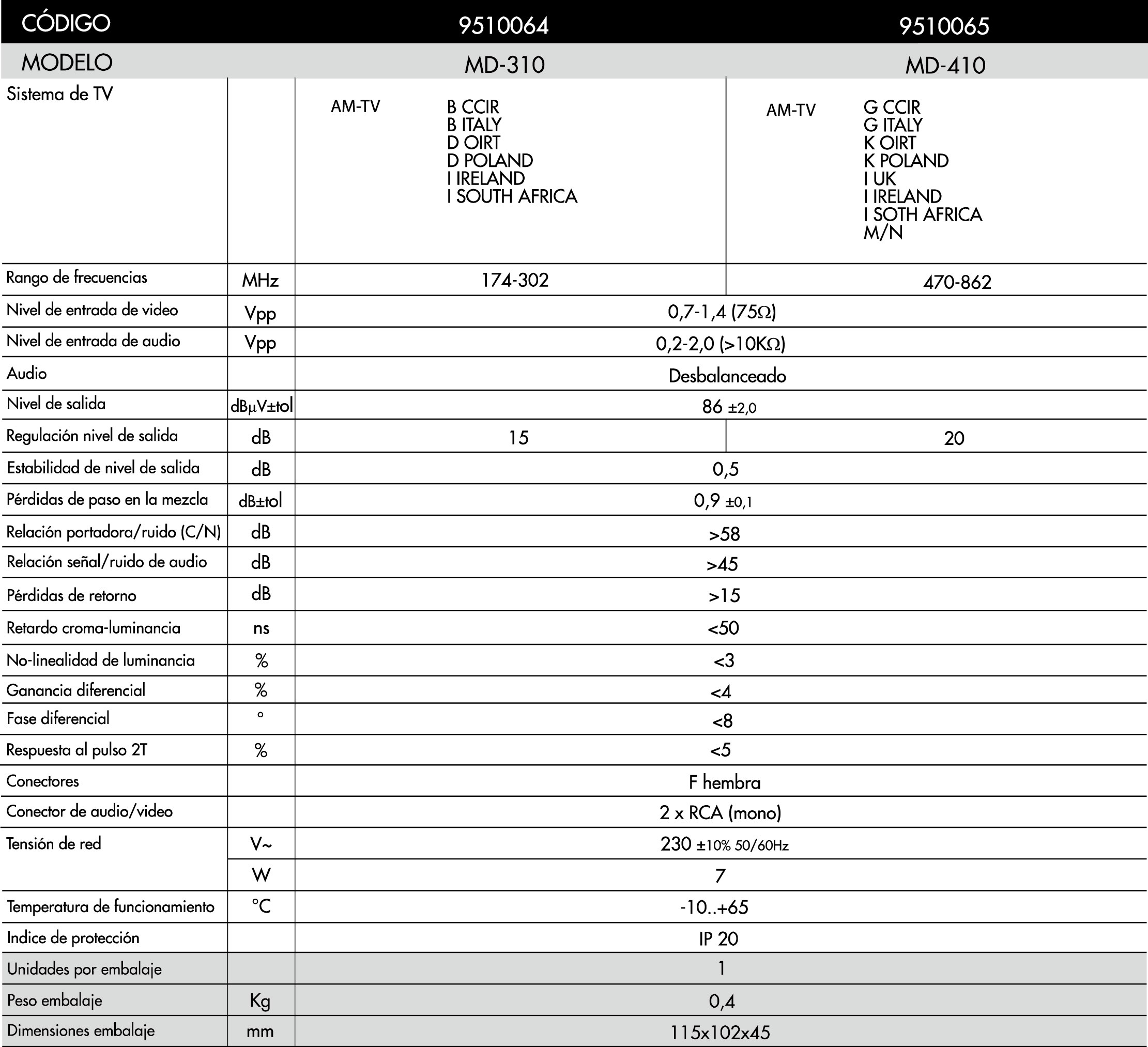 Modulador de TV con audio mono, que a partir de las señales de audio y video genera un canal de TV analógico. El canal generado se mezcla con el resto de canales de la instalación de TV. Disponible en diferentes bandas, con diferentes normas y tablas de canales.