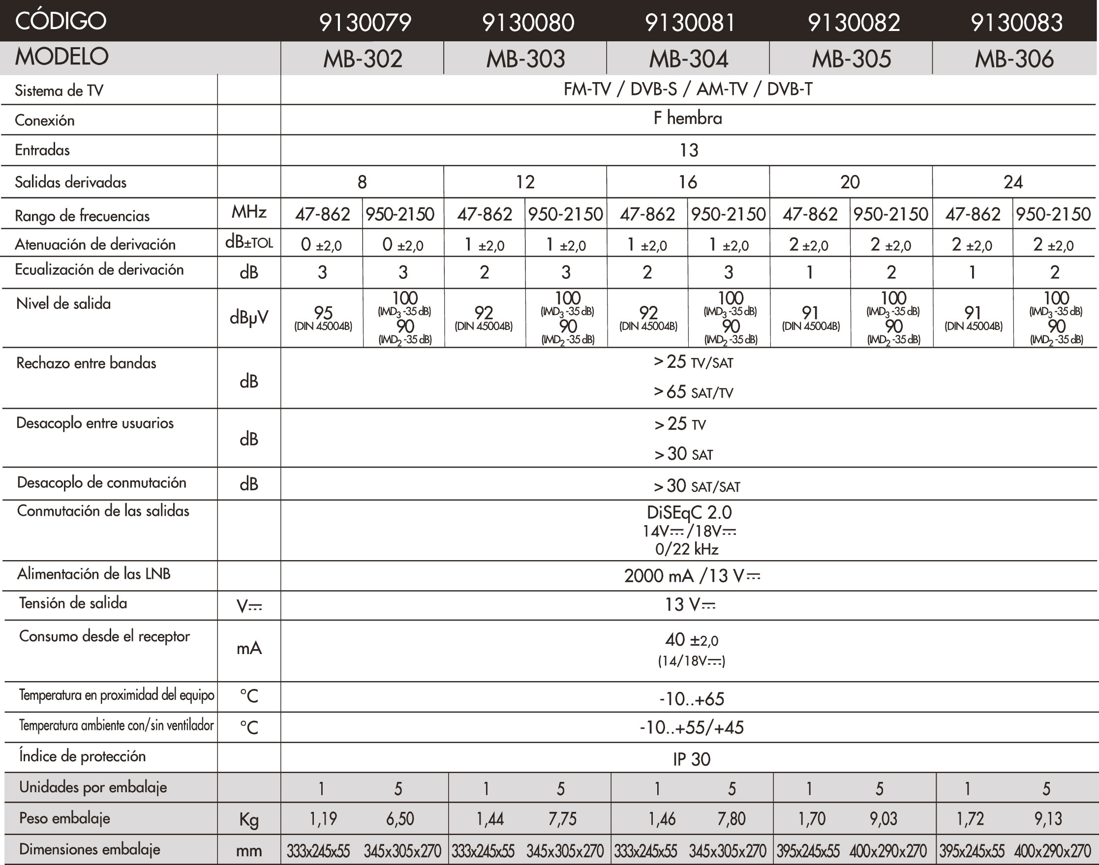 Multiconmutadores finales para 12 polaridades y TV terrestre con 8, 12 y 16 salidas. Las salidas están amplificadas en la banda de FI de satélite. En banda terrestre son configurables para que funcionen en modo activo o pasivo. Requiere de alimentación desde cada receptor individual para el funcionamiento de la conmutación y la amplificación de cada salida derivada. Los alimentadores externos proveen la tensión necesaria a las LNB para su funcionamiento.