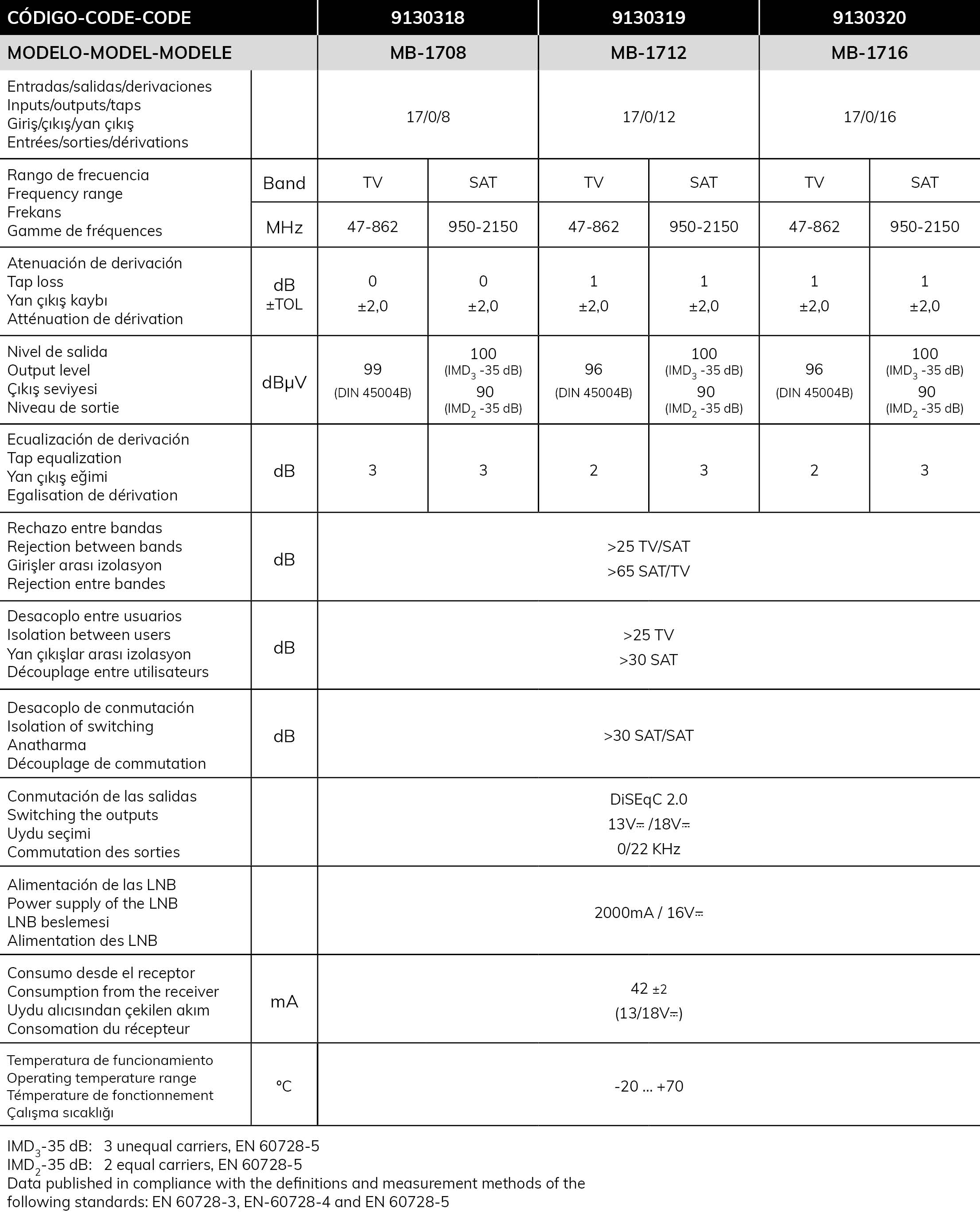 Multiconmutadores finales para 16 polaridades y TV terrestre con 8 salidas. Las salidas están amplificadas en la banda de FI de satélite. Requiere de alimentación desde cada receptor individual para el funcionamiento de la conmutación y la amplificación de cada salida derivada. El alimentador externo proporciona la tensión necesaria a las LNB para su correcto funcionamiento.