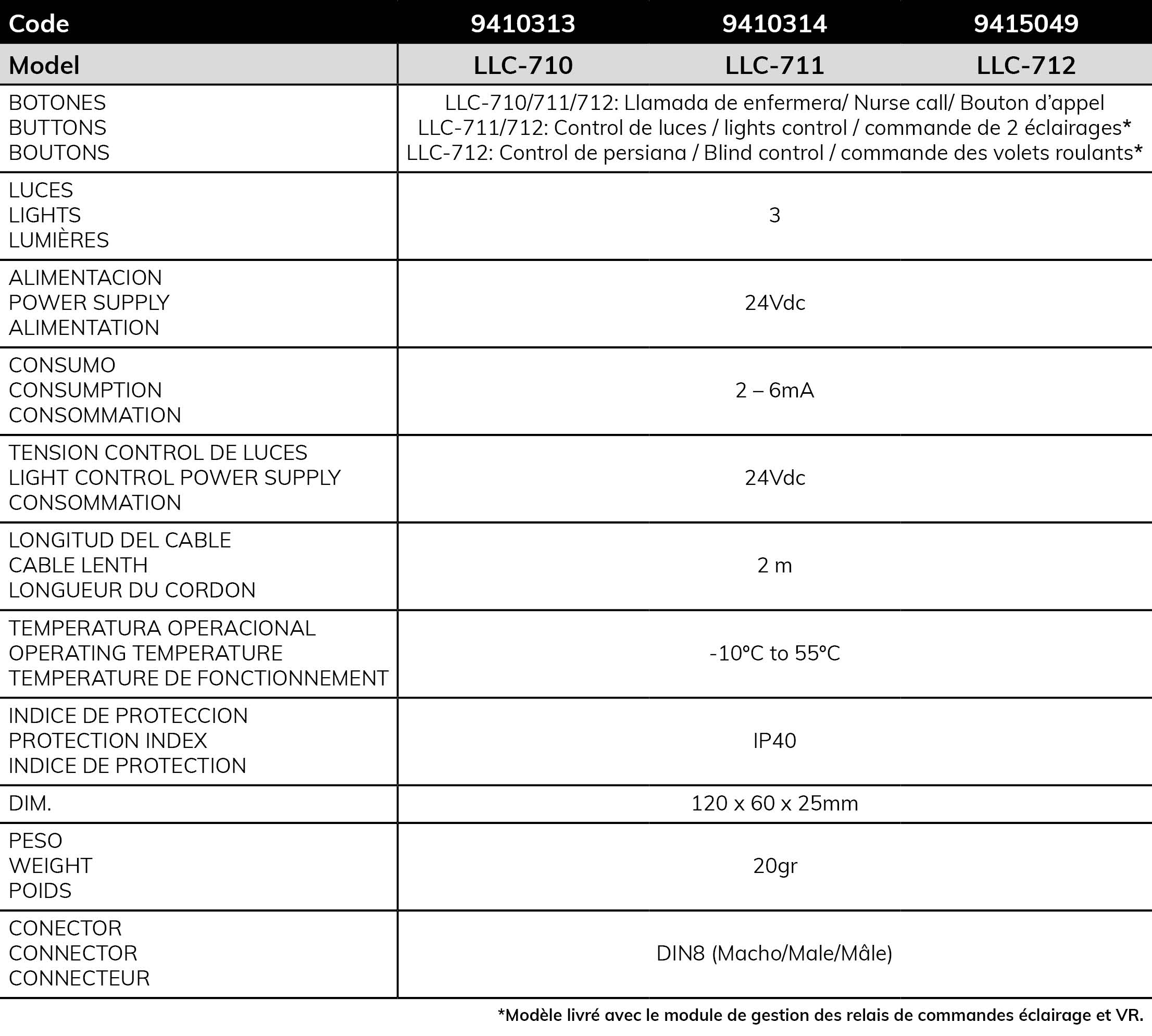 Pera de llamada con conector DIN-8 macho para conexión en base de pared LLC-80x y LLC-90x. Dispone de un pulsador de llamada a enfermera rojo con Braille, indicador LED rojo e indicador LED amarillo para notificación de estado de conexión. Permite al paciente lanzar una llamada mediante el accionado del pulsador de llamada e indica el estado de la llamda mediante el LED rojo de tranquilización. Periférico en bus con conector DIN8. Fácil de limpiar y conectar.