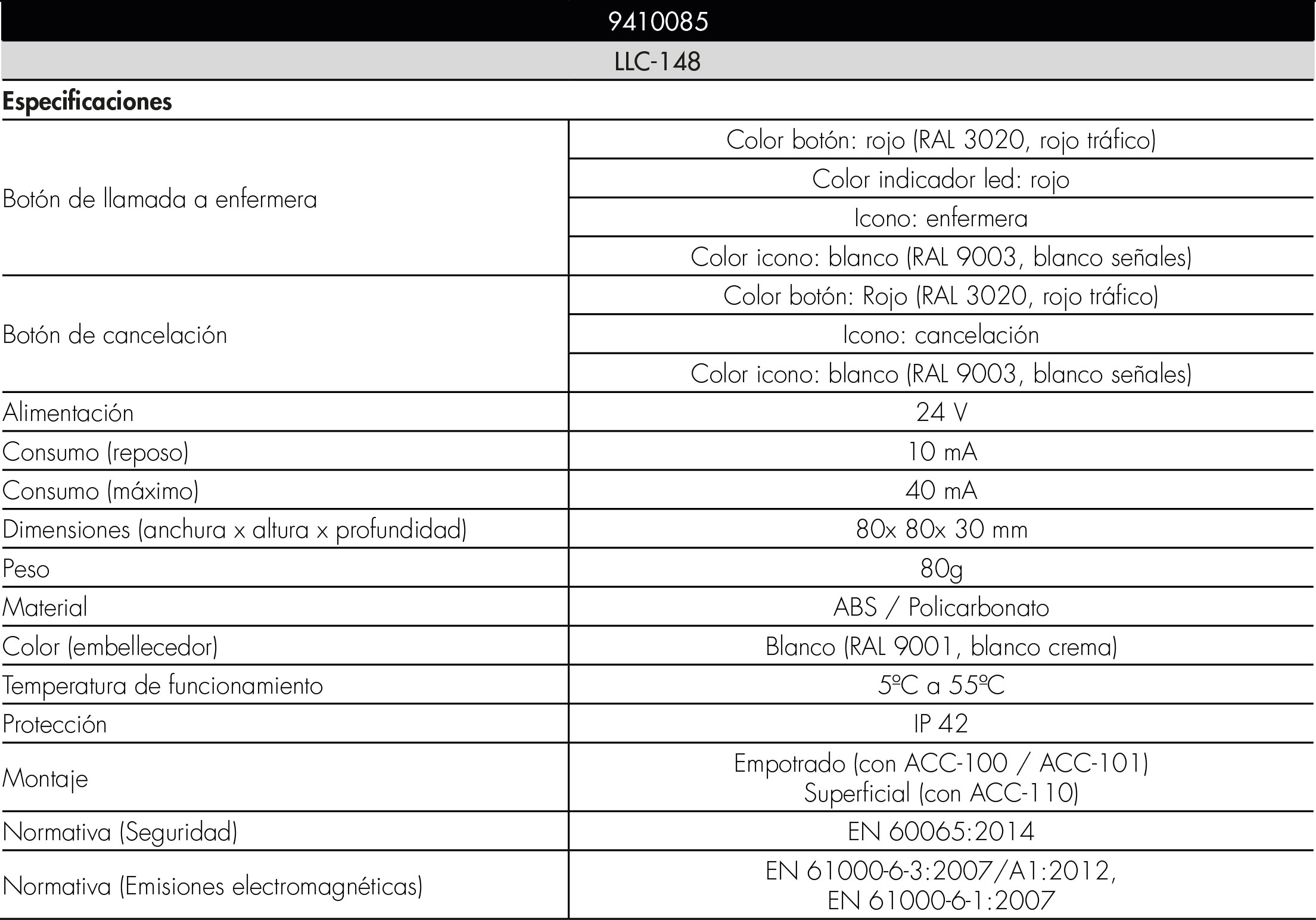 Periférico de habitación con pulsador de llamada a enfermera con indicador LED rojo y pulsador de cancelación. Permite lanzar una llamada de enfermera desde el pulsador de llamada rojo. Una vez iniciada la llamada, el indicador LED rojo permite una fácil identificación del lugar desde el que ha sido lanzada la llamada. Permite la cancelación de la llamada desde el pulsador de cancelación. Montaje empotrado o superficial.
