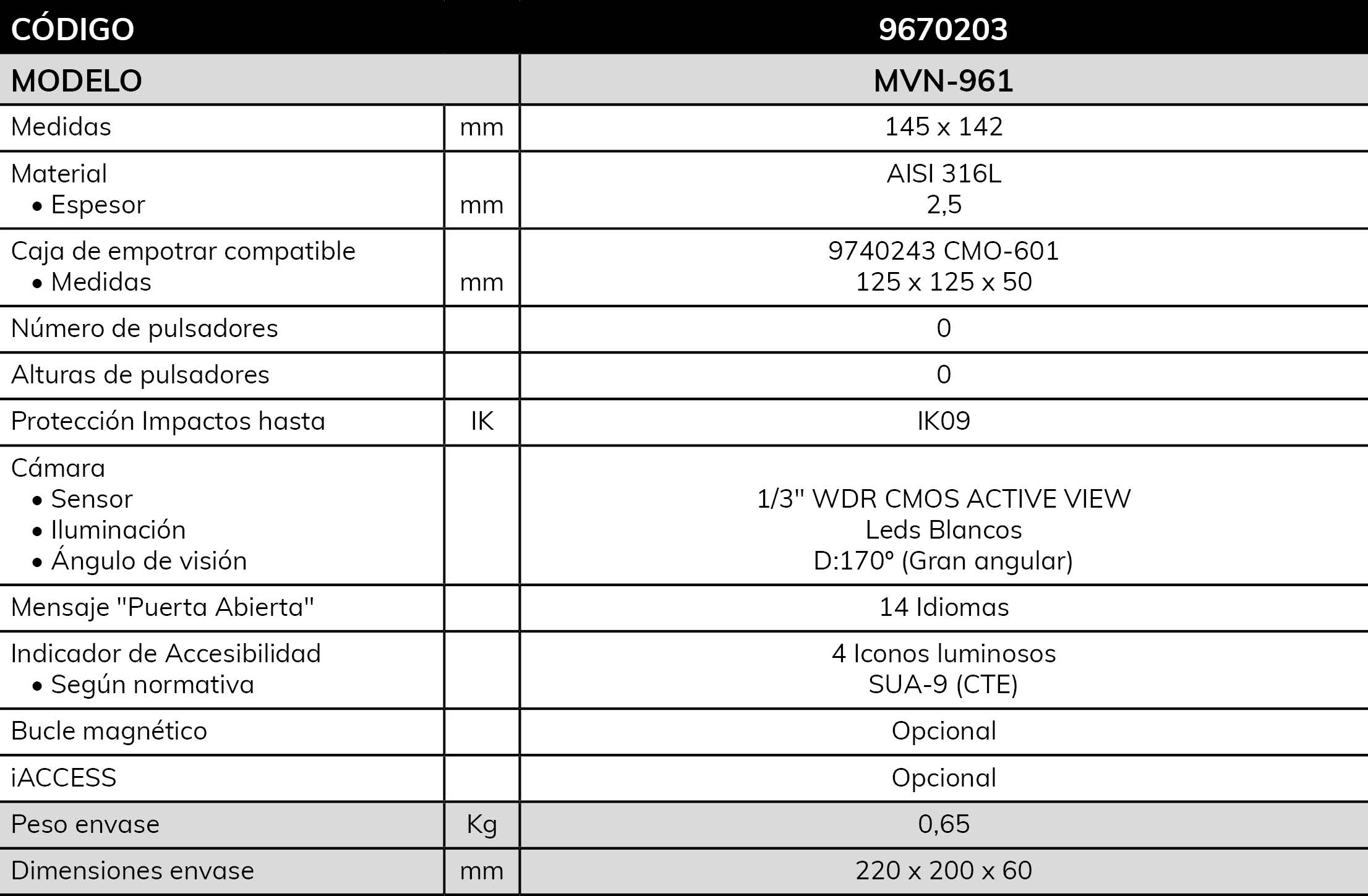 - Módulo de accesibilidad con sintetizador de voz con 14 idiomas seleccionables para mensaje de ''puerta abierta''. Incluye posibilidad de silenciarlo.