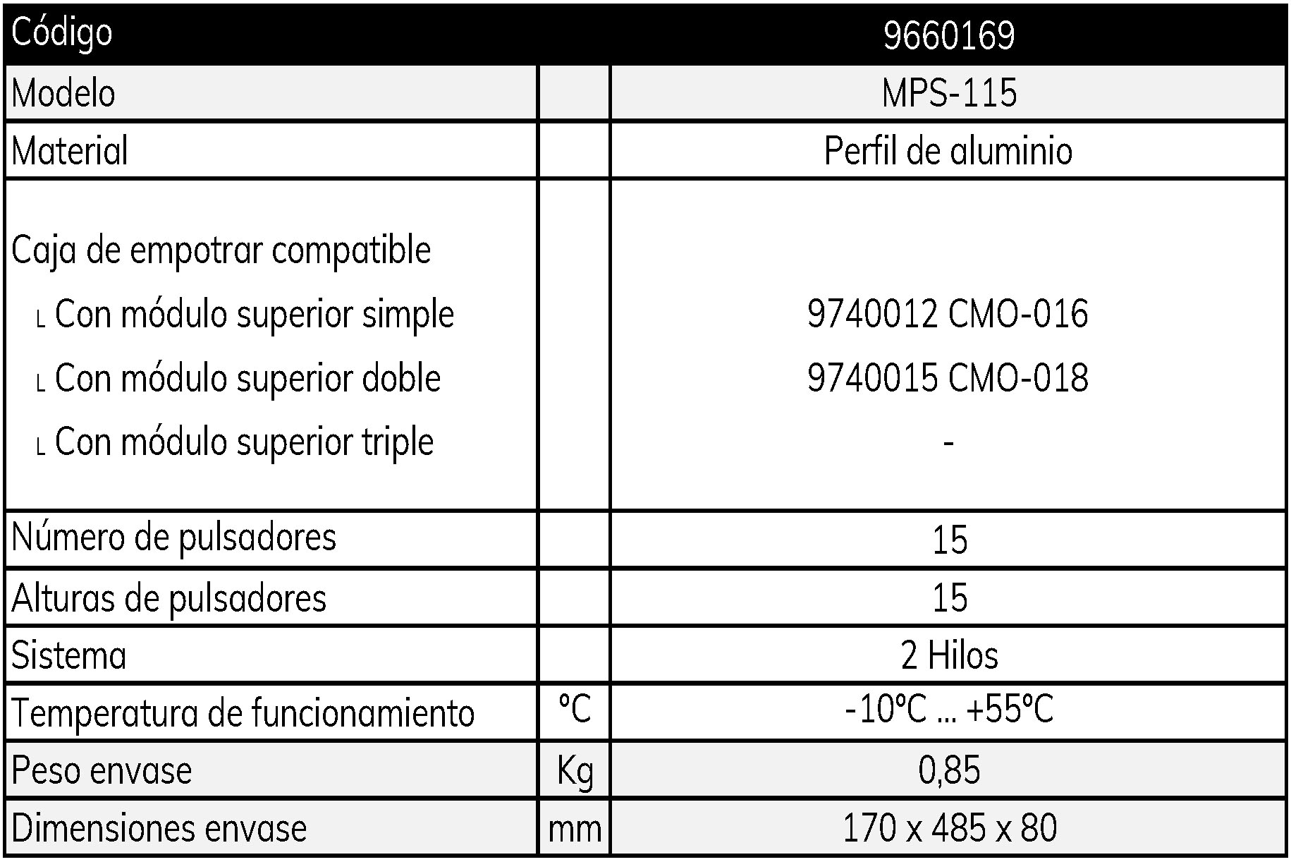 Disponible en formato modular, con módulos superiores e inferiores. El módulo superior puede ser simple, doble o triple. El módulo inferior o de pulsadores está disponible con pulsadores simples o dobles. Perfil de aluminio.