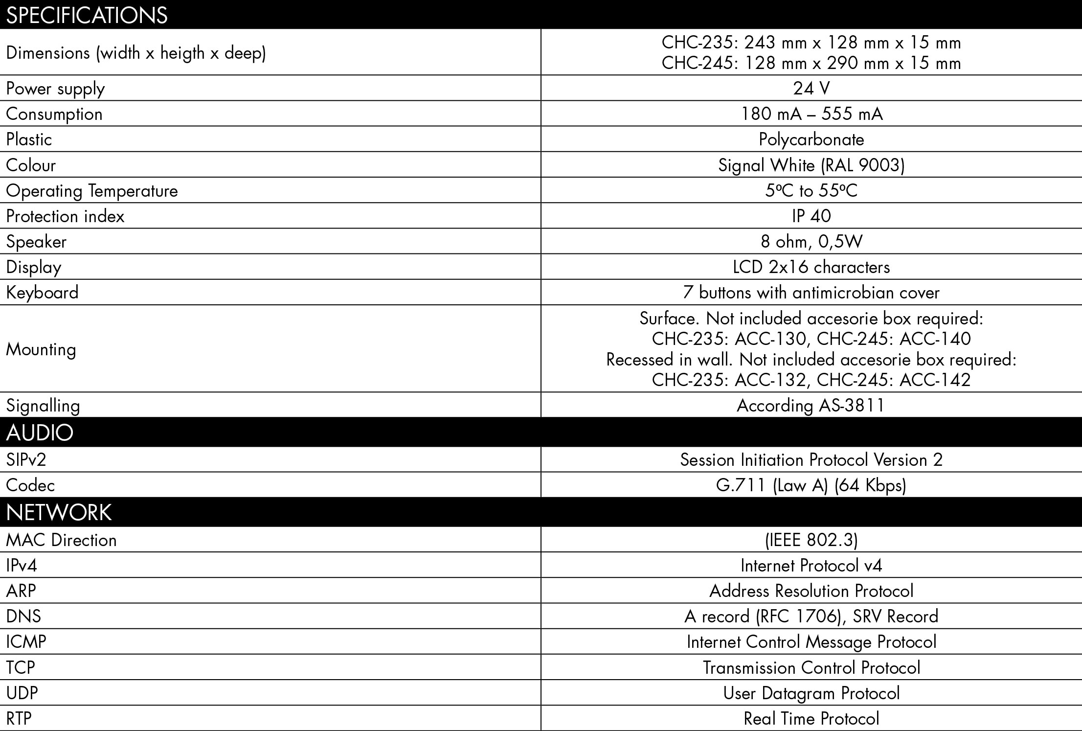 Diseñado específicamente para satisfacer las necesidades de durabilidad y fiabilidad requerida en los hospitales, el dispositivo tiene un diseño mecánico ultra-slim y robusto que se adapta tanto para montaje en superficie como empotrado en la pared. Gracias a su teclado capacitivo y plano es fácil de limpiar y en el caso del modelo CHC-234 su recubrimiento antimicrobiano previene la posible transmisión de bacterias y microbios entre habitaciones por el uso del teclado por parte del personal. La superficie del dispositivo es compatible con productos de limpieza agresivos utilizados para la desinfección del material en hospitales. Tiene un teclado capacitivo con retroiluminación que permite al personal activar diferentes tipos llamadas y documentar las tareas que se realizan en la habitación. A su vez incorpora una pantalla LCD con información sobre el estado del dispositivo, los eventos y alarmas activas en la habitación. Al estar basado en la tecnología VoIP y debido a su conexión a una red de datos a través de su conector RJ45 puede intercomunicarse con otras centrales de habitación ubicadas en la misma zona, permitiendo convertir la habitación en un punto de control de enfermería más mientras una enfermera esté presente en la habitación.